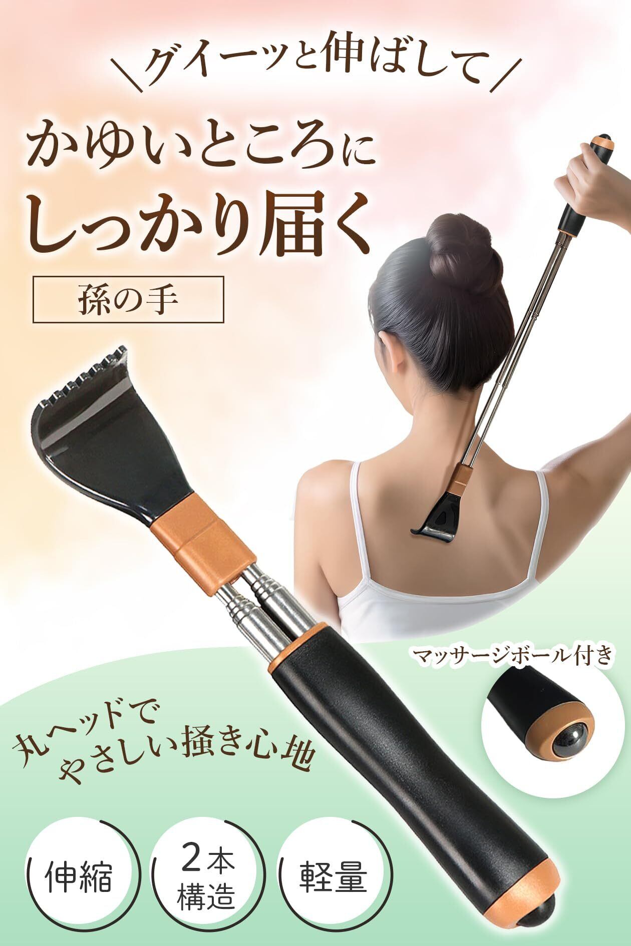 孫の手 まごの手 ブラシ 伸縮 背中かき棒 最長54㎝ 掻きやすい 折れにくい2本構造 コンパクト 軽量 持ち運びやすい