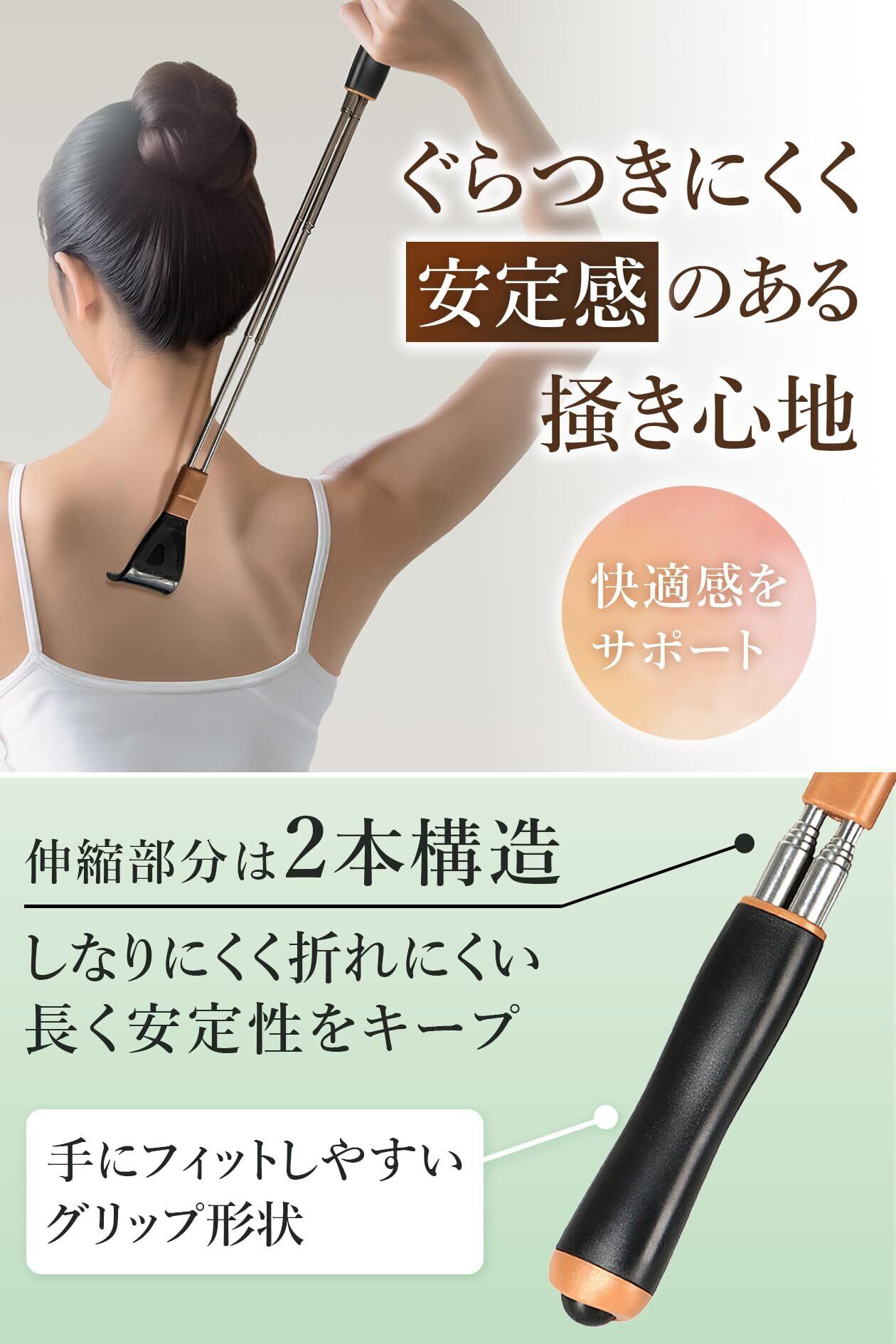 【伸縮2本構造で安定性抜群】伸縮2本構造で強度と安定性を実現。伸ばしても長さが戻らず、背中の隅々までしっかり掻けます。ヘッドデザインも丸くなめらか加工仕様なのでやさしい掻き心地に。