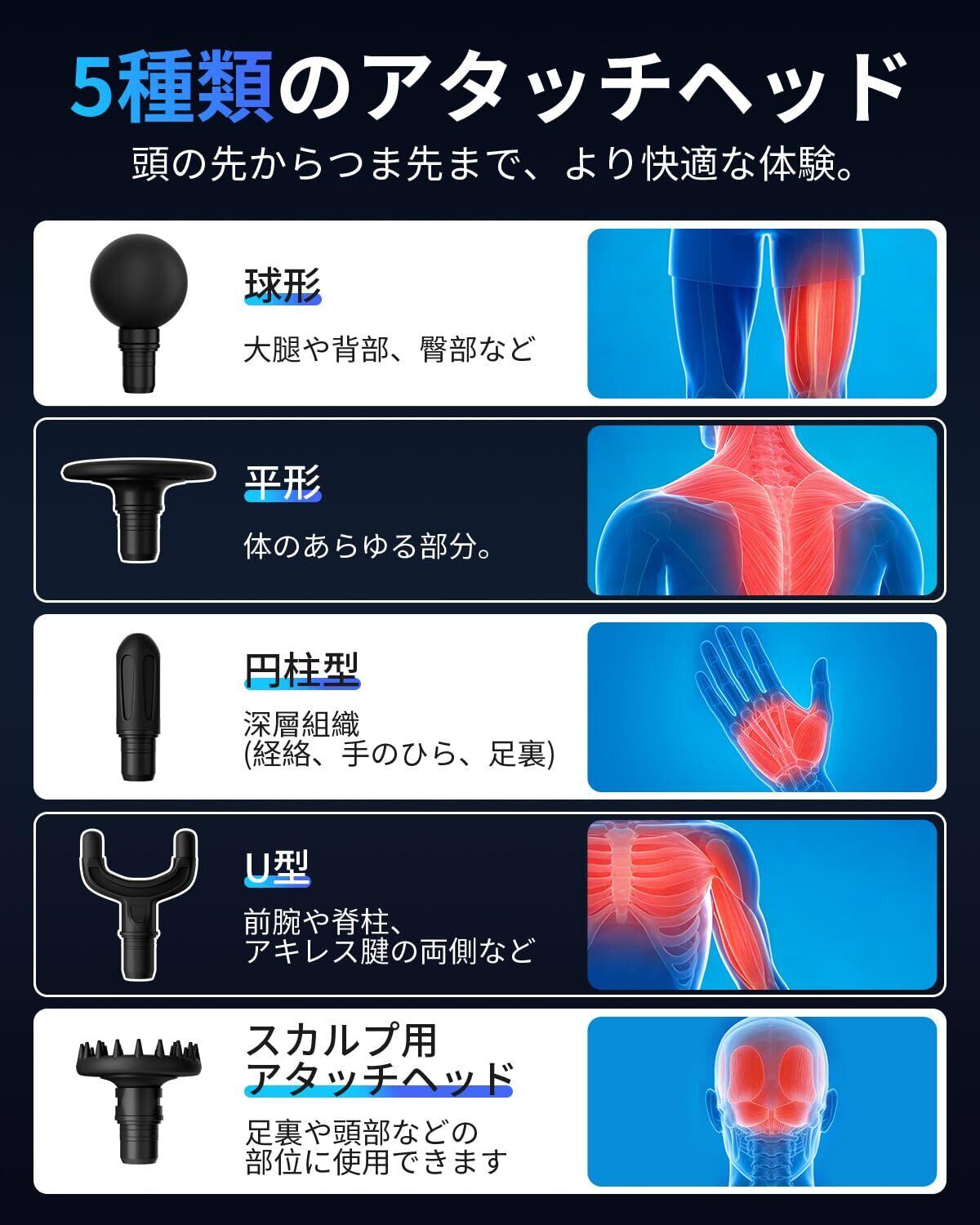【全身ケアの5種類アタッチメント】「頭の先からつま先まで」をコンセプトに、5種類の専用アタッチメントが付属。それぞれ体の部位や悩みに合わせて簡単に交換できます。アタッチメントは高品質な素材を採用し、肌触りも良好です。ボール型は太もも、ふくらはぎ、お尻など大きな筋肉群のほぐしに最適で、やや柔らかめのため初心者にもおすすめ。フラット型は背中や肩甲骨周りなど筋肉の広い面を広範囲にリリースし、筋膜リリースに効果的。円柱型は足裏や手掌、筋膜のラインなど、ピンポイントに刺激を与えたい箇所に使用し、深部までアプローチします。U字型はアキレス腱、首筋、背骨に沿った部分など、突起物を避けながらケアできる形状。スカルプ用は足裏、頭皮やこめかみ、顔周りのリラックスに優しい刺激で血行を促進します。心地よい使い心地を保つために、ヘッド交換時は電源を切り、一か所の連続使用は3分程度を目安にしてください。