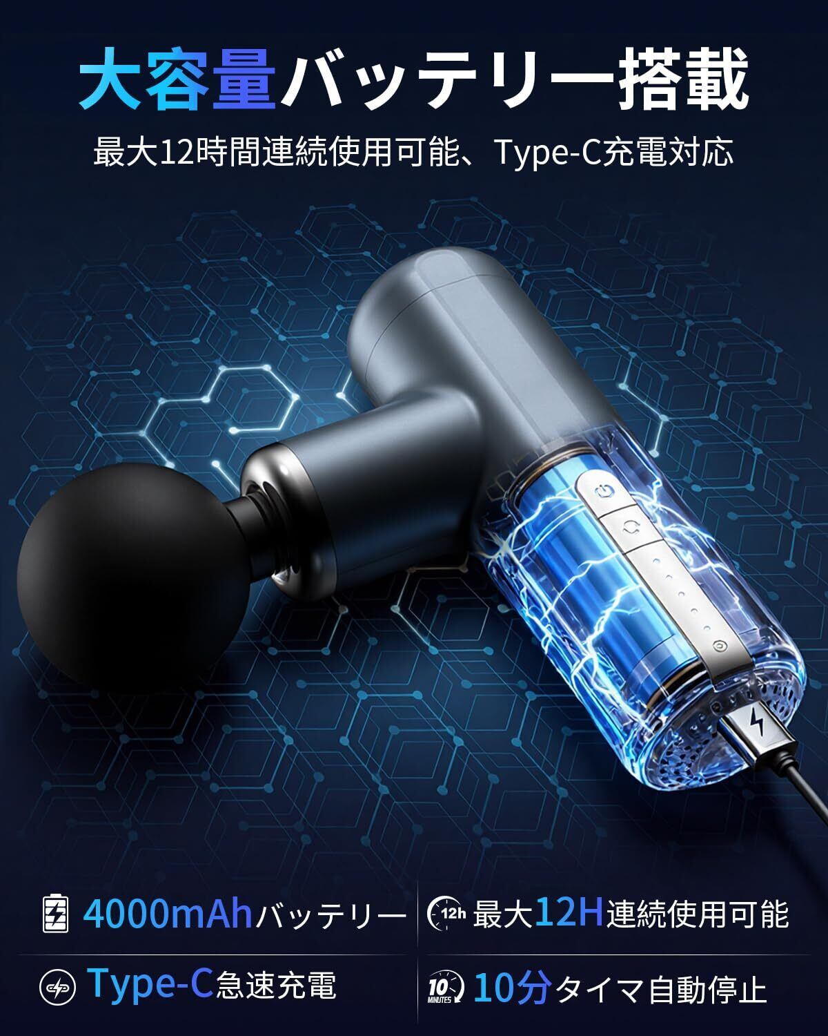 【大容量バッテリー搭載&Type-C急速充電】4,000mAhの大容量バッテリーを内蔵し、フル充電で最長約12時間の長時間連続使用が可能。週末の旅行や長期出張、ジムでの継続的なケアにも十分なバッテリーライフを実現します。充電端子は汎用性の高いUSB Type-Cを採用し、スマートフォン用のケーブルと共用可能。急速充電に対応しており、短時間でフル充電が完了します。また、安全と使い過ぎを考慮し、使用時間10分で自動停止するように設計しました。引き続きご使用になりたい場合は、ボタンを押して電源をオンにしてください。※電池の残量、充電環境および使用環境によって、充電時間や動作時間が大きく前後します。