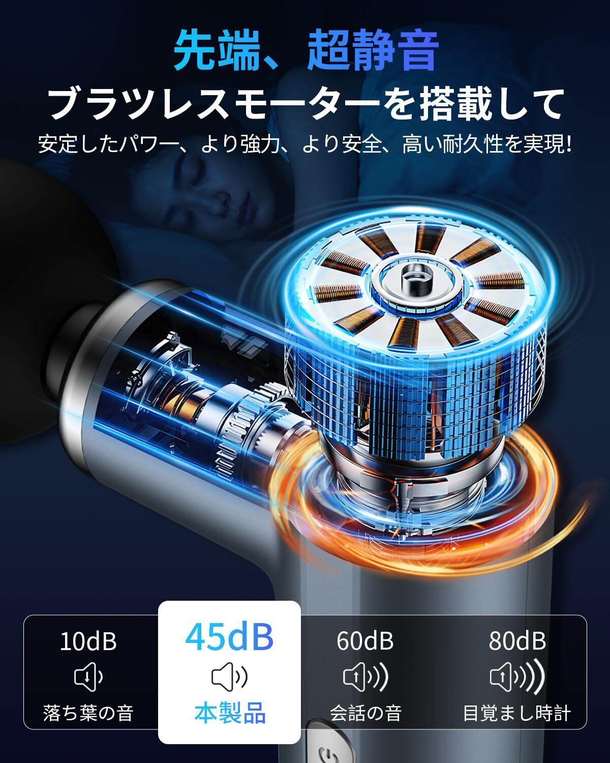 【超静音設計&携帯に便利】この筋膜ガンは、高性能なブラシレスモーターを搭載しており、従来モデルと比較して効率が約3倍に向上。安定性に優れ、安全性も高められています。最大回転数3,200回転/分での使用時でも騒音レベルが極めて低く、業界トップクラスの45dBという低動作音を実現。ジムやご自宅、オフィスなど、音が気になる環境でも快適にご使用いただけます。ハンドル部分には高級感のある滑り止め加工を施し、汗をかいても安定したグリップを維持。重さはわずか320g、長時間使用しても疲れにくい設計です。さらに、収納ケースが付属しているため、持ち運びや収納にも便利です。