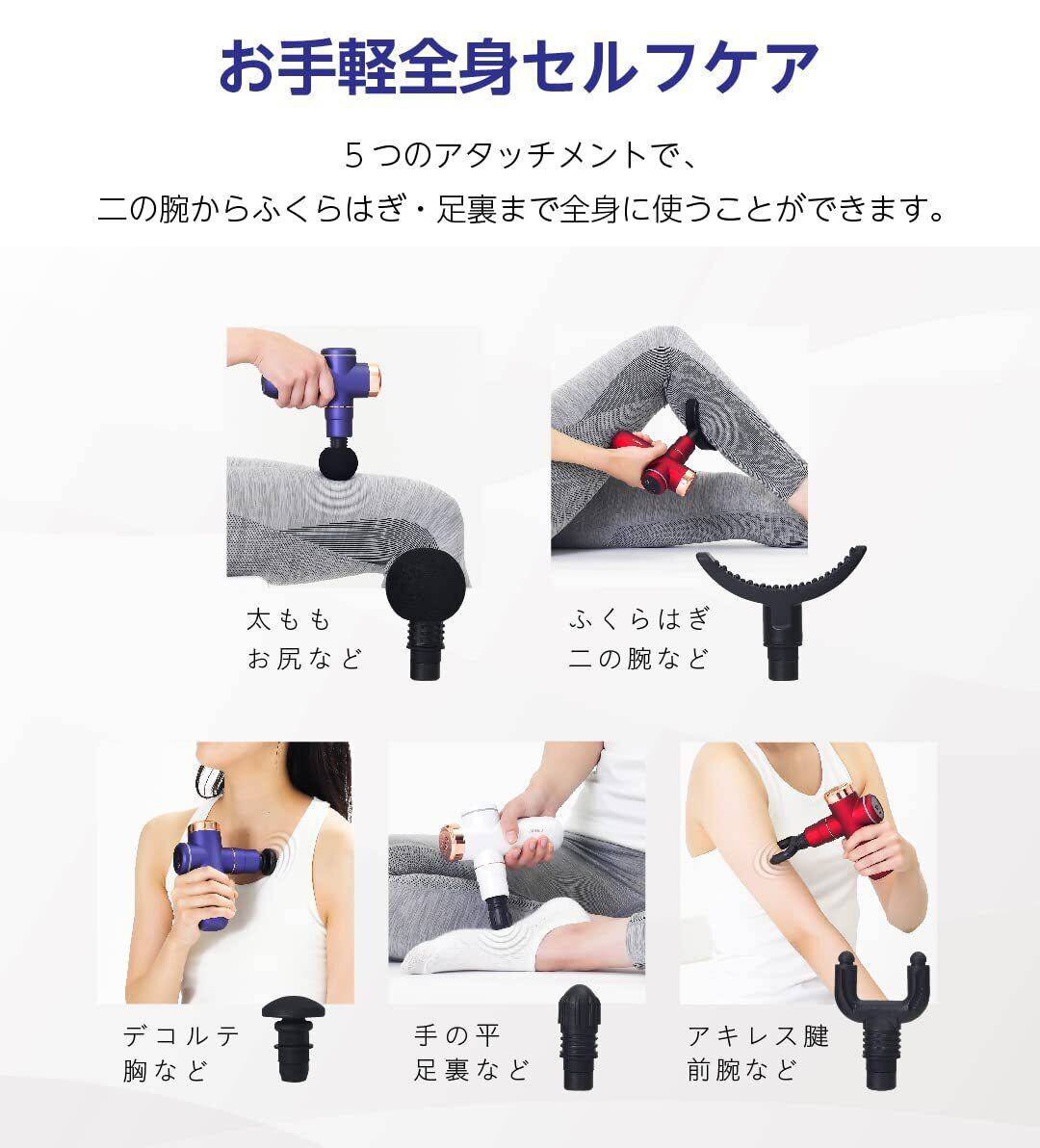 【アタッチメント5種付き】ボール型/ポイント型/カーブ型/U字型/アーチ型の5種類のアタッチメント付き。アタッチメントを付け替えることで、カラダの各部位にフィットし最適なケアができます。