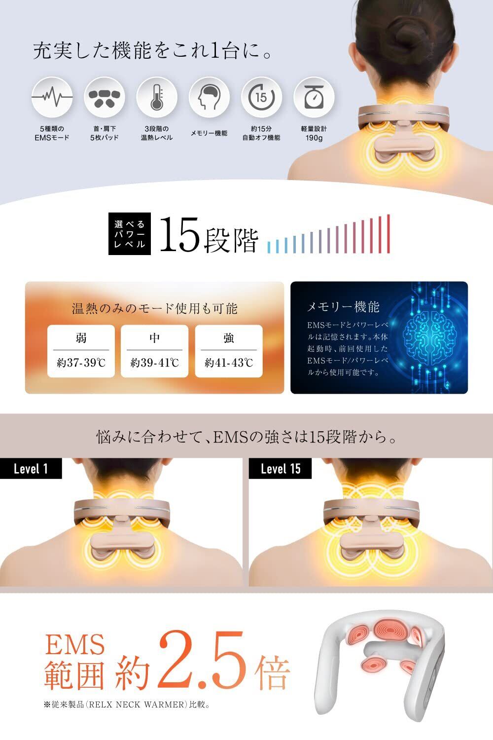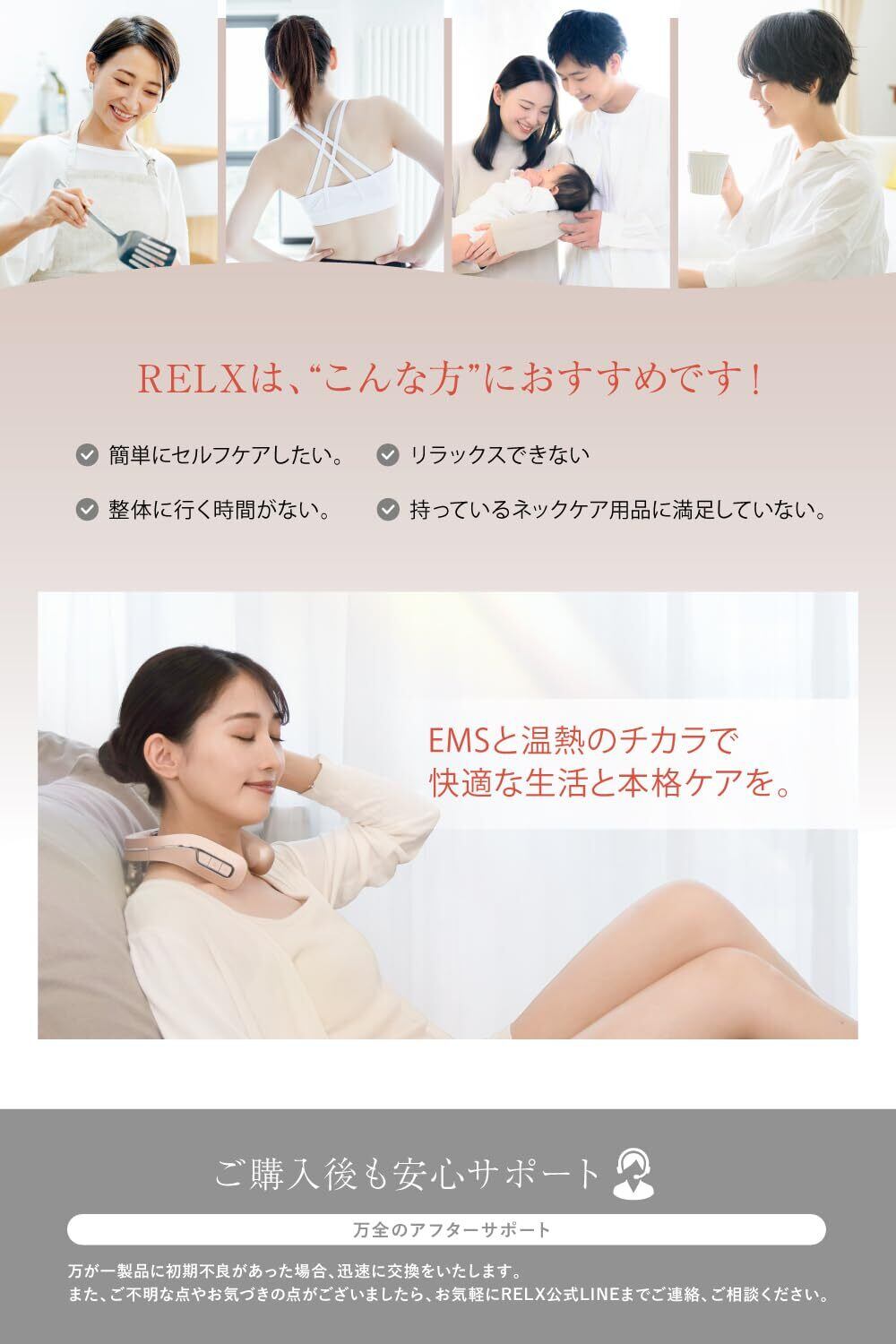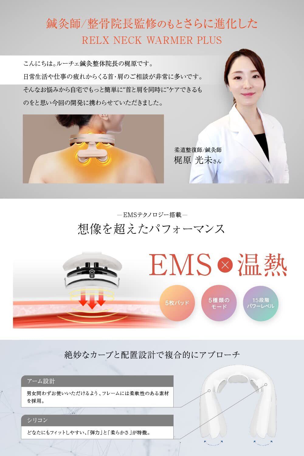 首・肩5枚パッド「速暖温熱」+「EMS」が想像を超えたパフォーマンスをお届けします。男女ともにお使いいただけるユニセックスのサイズ感。柔軟性のあるシリコンと絶妙なカーブ、電極パッドの配置にこだわったネックウォーマー。首と肩下の各パッド部分は取り外し可能なので、その日の気分に合わせてご使用いただけます。さらに進化したRELX NECK WARMER PLUSをぜひご体感ください。【本体重量】約190g。【本体サイズ】約146x164x87㎜