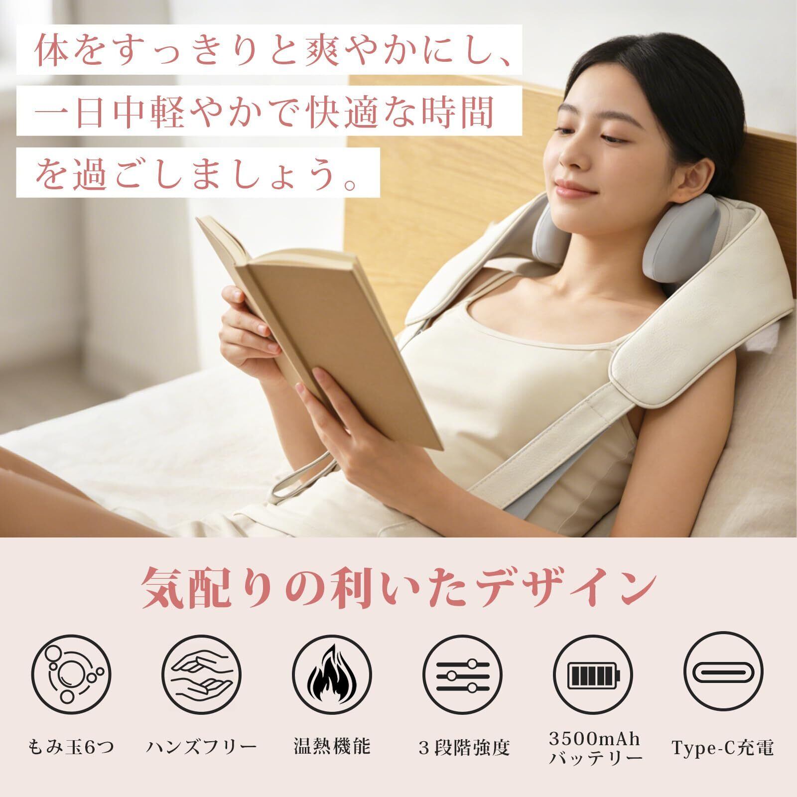 首 リラクゼーション 首・肩・腰・背中・太もも・ふくらはぎ 6つのもみ玉 広範囲 2種類モード 3段階強度調節 2段階温熱機能 10分自動オフ 長さ調節可能 コードレス Type-C充電式 洗える布カバー 静音 コンパクト 操作簡単 男女兼用 家庭用 職場用 プレゼント 母の日 父の日 記念日 誕生日 クリスマス 新年 お祝い 日本語説明書 一年