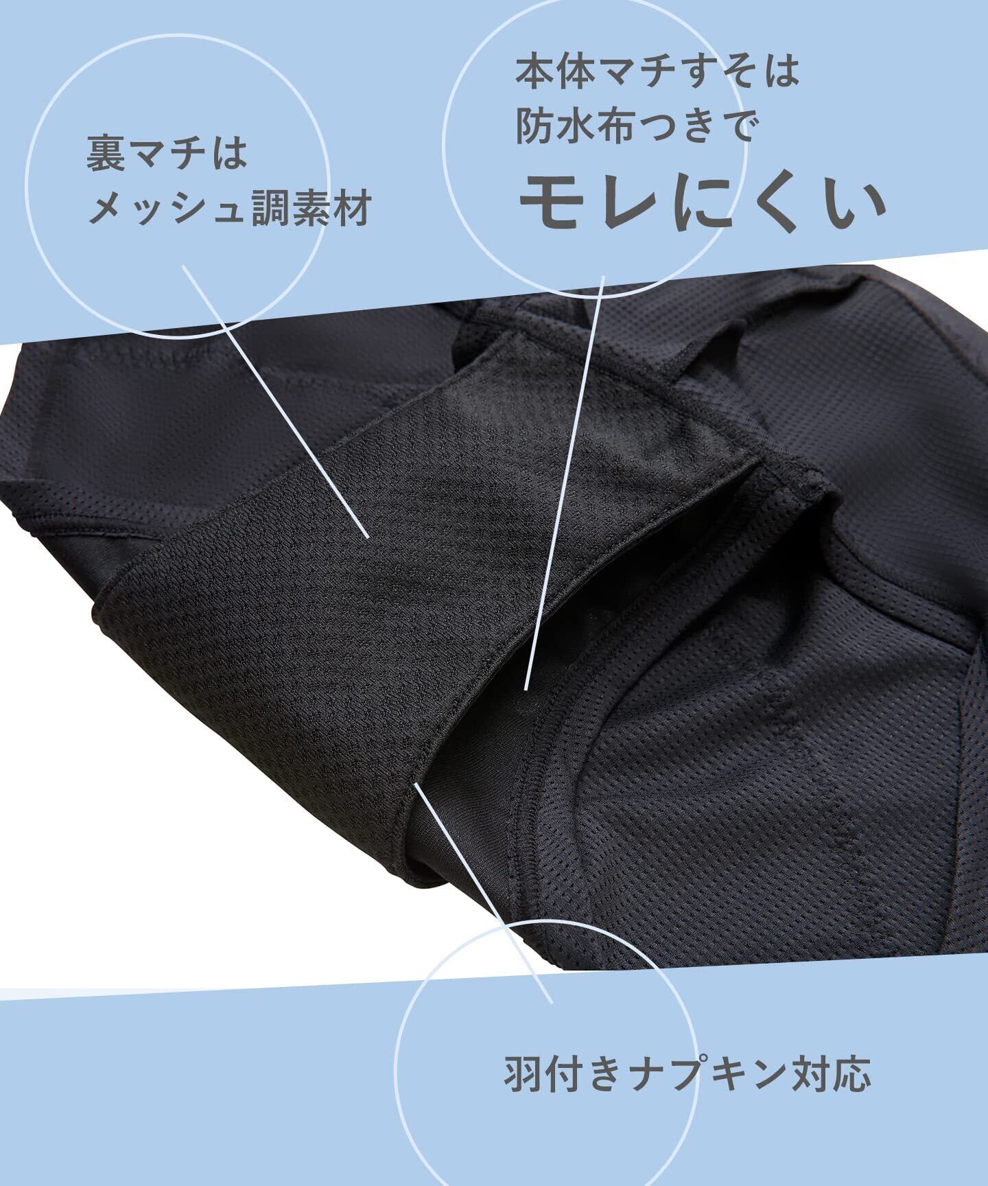 大きな扇形の防水布が、マチ部~おしり側までカバーしてモレにくい