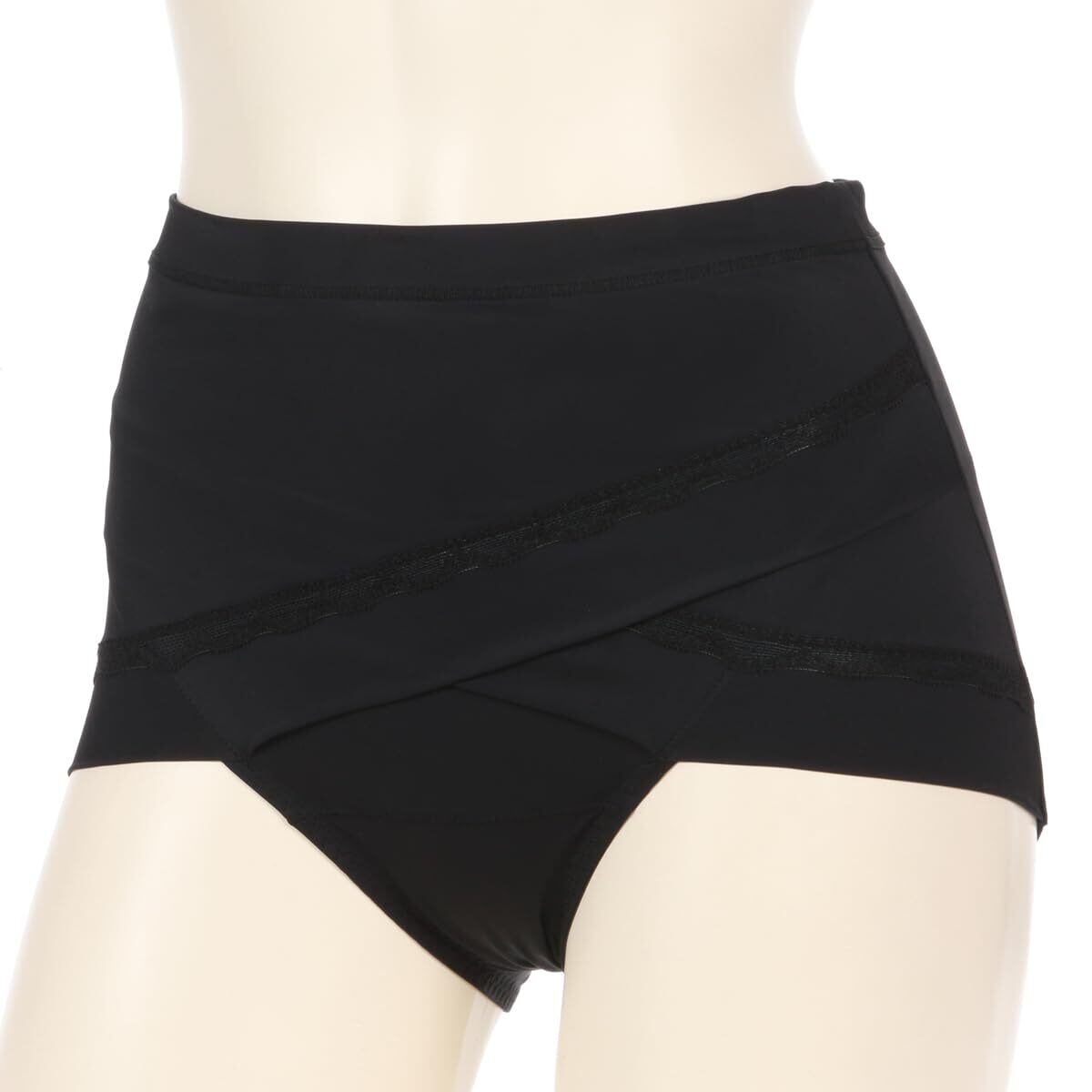 折り返しのクロス構造で骨盤周りを引き締めて、気になるぽっこりお腹もすっきり見せ!