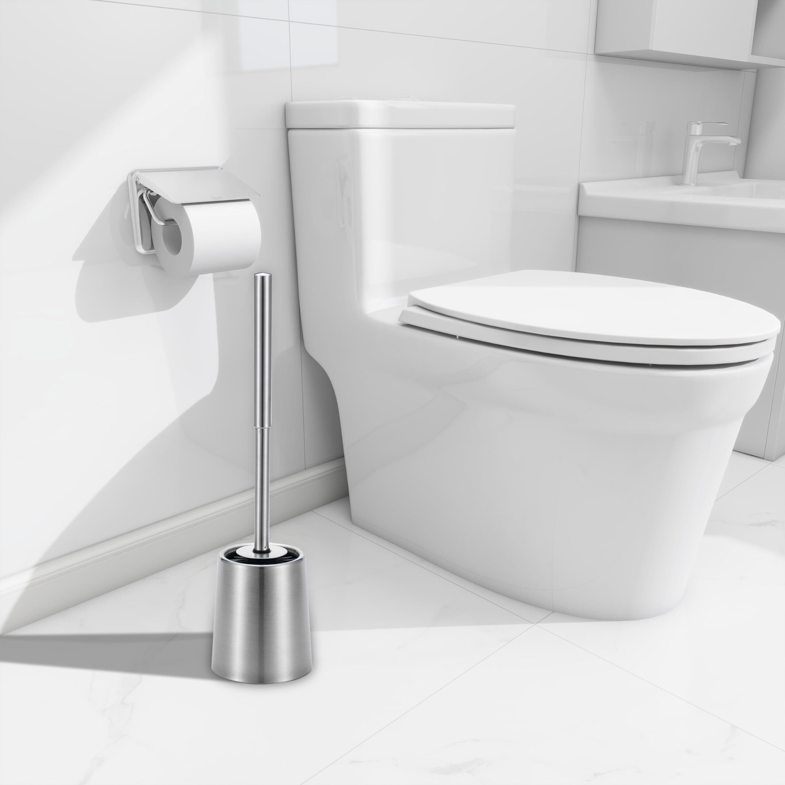 【SUS304 ステンレス鋼製のトイレブラシとホルダー】: 304ステンレス鋼で作られたトイレブラシで、耐久性、防錆能力、腐食防止どちらも素晴らしいです.厚いステンレスは手触りが良く、何年も使用してトイレ掃除の優れた性能を発揮します。 あらゆる種類の便器とバスルーム用に設計されています。