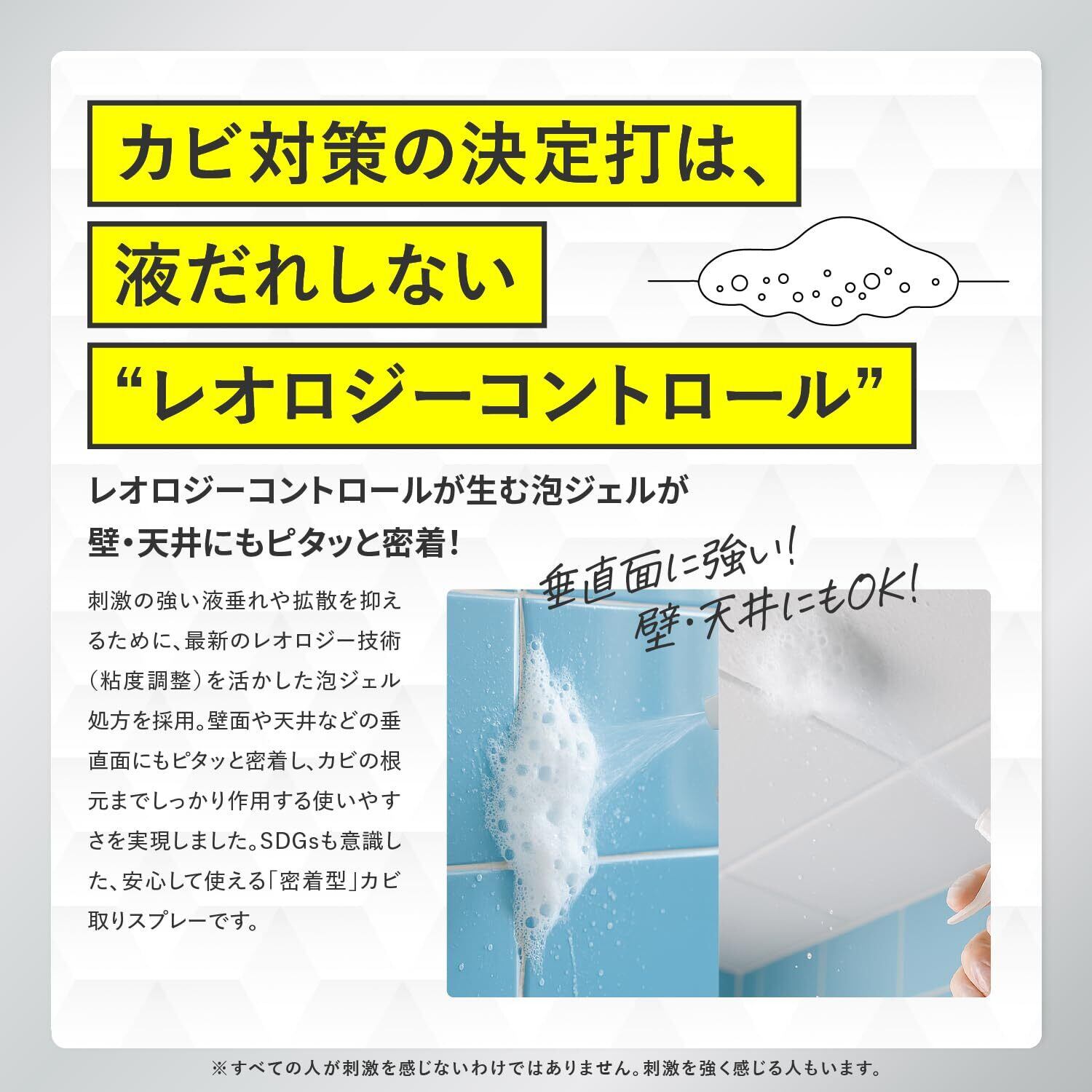 ■垂直面でも液ダレしにくい! 浴室の壁や浴槽側面にしっかり密着するジェルスプレータイプ。液ダレしないので、天井や浴室の壁やタイル、ゴムパッキンなど、様々な場所で使用可能。
