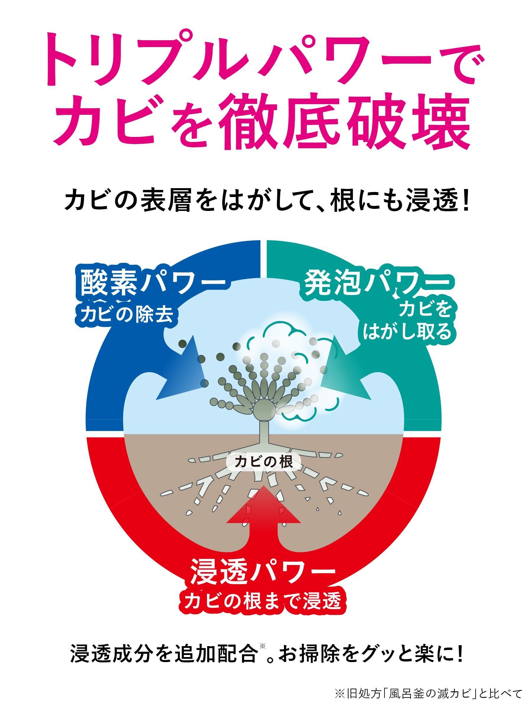 酸素×浸透×発泡のトリプルパワーでカビを除去。2剤混合タイプの風呂釜クリーナー。 頑固なカビの根の奥深くまで浸透し、お掃除をグッと楽にします。お風呂小物の洗浄にも。
