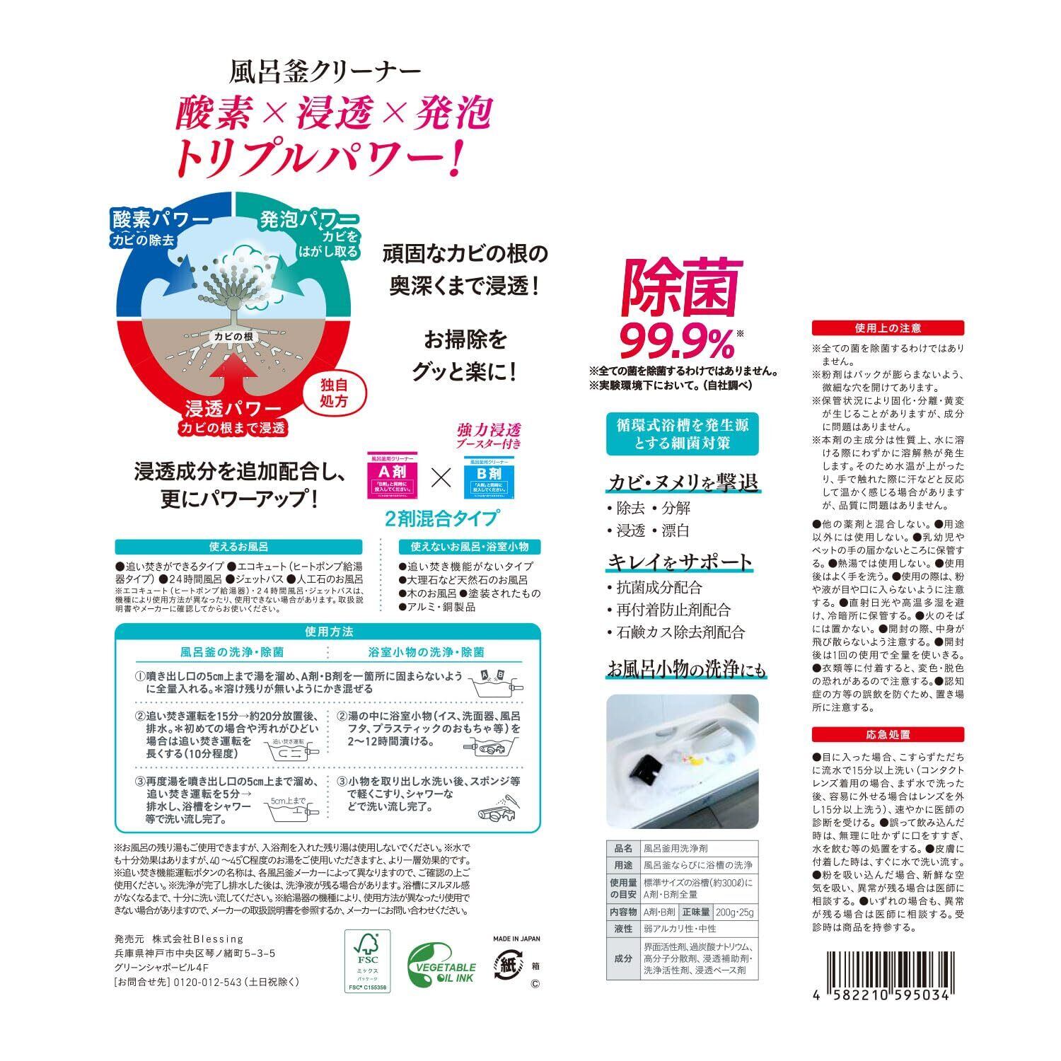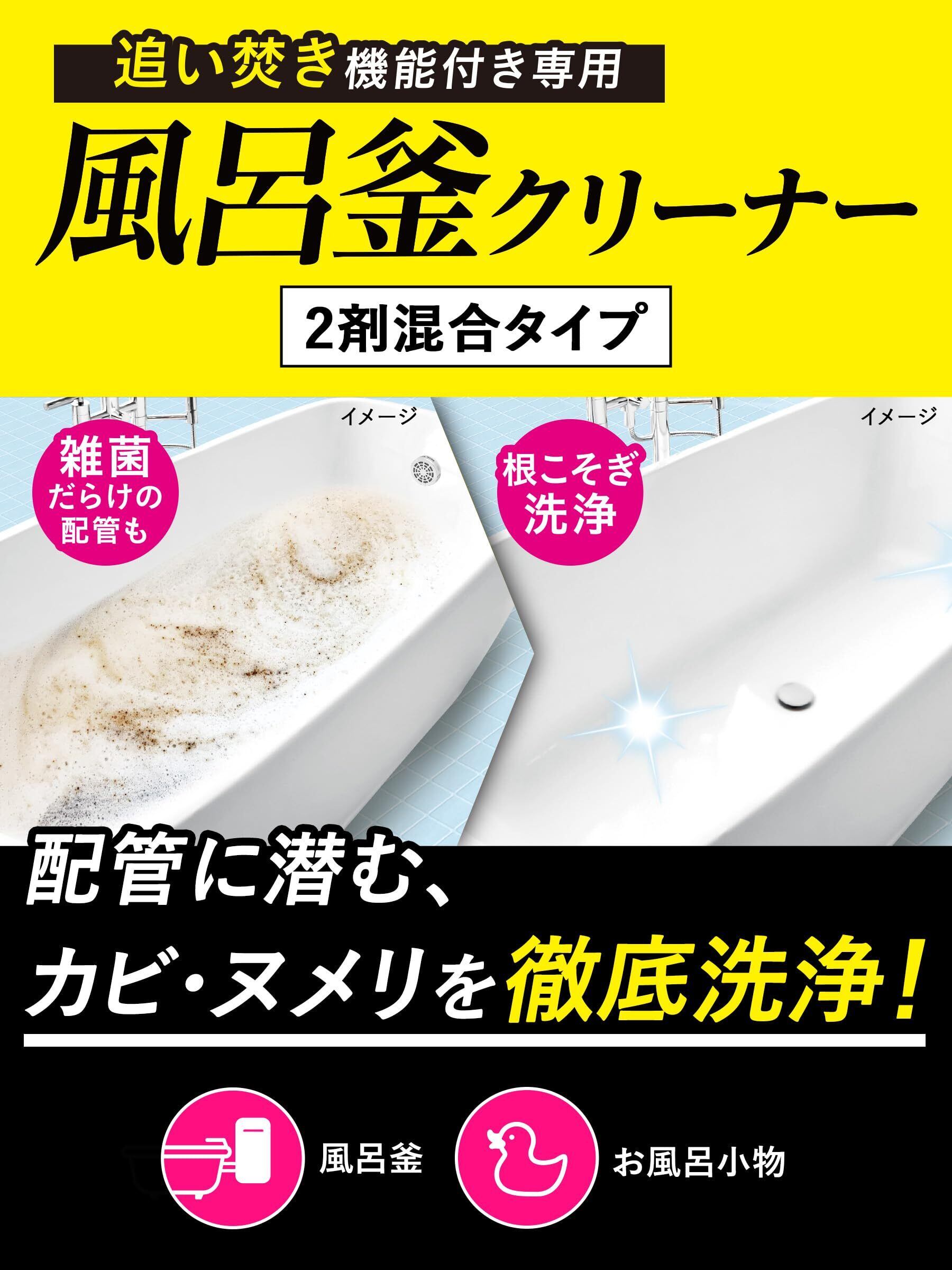 酸素×浸透×発泡のトリプルパワーでカビを除去。2包混合タイプの風呂釜クリーナー。 カビの根、雑菌、湯ドロ、皮脂、ヌメリをまとめて分解洗浄し、お掃除回数をグッと減らします。 ●除菌99.99%(※全ての菌を除菌するわけではありません。※自社調べ) ●循環式浴槽を発生源とする細菌対策に ●再付着防止剤・石鹸カス除去剤・抗菌成分配合 ●自然に還る安心成分 ●使えるお風呂:追い焚きができるタイプ/エコキュート(ヒートポンプ給湯器タイプ)/24時間風呂/ジェットバス/人口石のお風呂 ※エコキュート(ヒートポンプ給湯器)・24時間風呂・ジェットバスは、機種により使用方法が異なったり、使用できない場合があります。取扱説明書やメーカーに確認してからお使いください。 ●使えないお風呂・浴室小物:追い焚き機能がないタイプ/大理石など天然石のお風呂/木のお風呂/塗装されたもの/アルミ・銅製品 ※パッケージデザイン等は予告なく変更されることがあります 原材料・成分 【A剤】界面活性剤、過炭酸ナトリウム、高分子分散剤、浸透補助剤【B剤】洗浄活性剤、浸透ベース剤 使用方法 【風呂釜の洗浄・除菌】(1)残り湯または、湯を噴き出し口の5cm上まで溜めます。(2)本品A剤・B剤を1箇所に固まらないように全量入れ、追い焚き運転を15分行ってください。その後15~20分放置し、排水してください。(初めて使用の場合、冷水から使用する場合、汚れがひどい場合、長期間洗浄していない場合は、追い焚き運転の時間を長くすることをお勧めします。)(3)再度水か湯を噴き出し口の5cm上まで溜め、追い焚き運転を5分行い排水してください。(4)浴槽をシャワー等で十分に洗い流してください。【浴室小物の洗浄・除菌】(1)噴き出し口より約5cm上になるように浴槽内の水位を調整し、本品A剤・B剤を1箇所に固まらないように全量入れ、溶け残りがないようにかき混ぜてください。(2)水の中に浴室小物(イス、洗面器、風呂フタ、プラスチックのおもちゃ等)を2~12時間つけこみます。(3)小物を取り出し、水洗いします。汚れが残っている場合はスポンジ等で軽くこすってください。/※お風呂の残り湯もご使用できますが、入浴剤を入れた残り湯は使用しないでください。※水でも十分効果はありますが、40~45℃程度のお湯をご使用いただきますと、より一層効果的です。※追い焚き機能運転ボタンの名称は、各風呂釜メーカーによって異なりますので、ご確認の上ご使用ください。※洗浄が完了し排水した後は、洗浄液が残る場合があります。浴槽にヌルヌル感がなくなるまで、十分に洗い流してください。※給湯器の機種により、使用方法が異なったり使用できない場合がありますので、メーカーの取扱説明書を参照するか、メーカーにお問い合わせください。 続きを見る