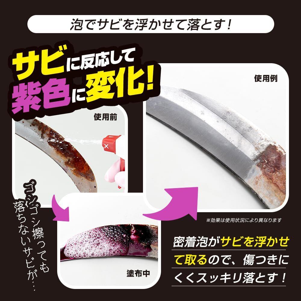 【サビを浮かせて落とす】サビに反応すると、液が紫色に変化し、落ちているのが一目瞭然!サビを浮かせて落とすので、対象物を傷つきにくい。さらに中性タイプで素材に優しい。