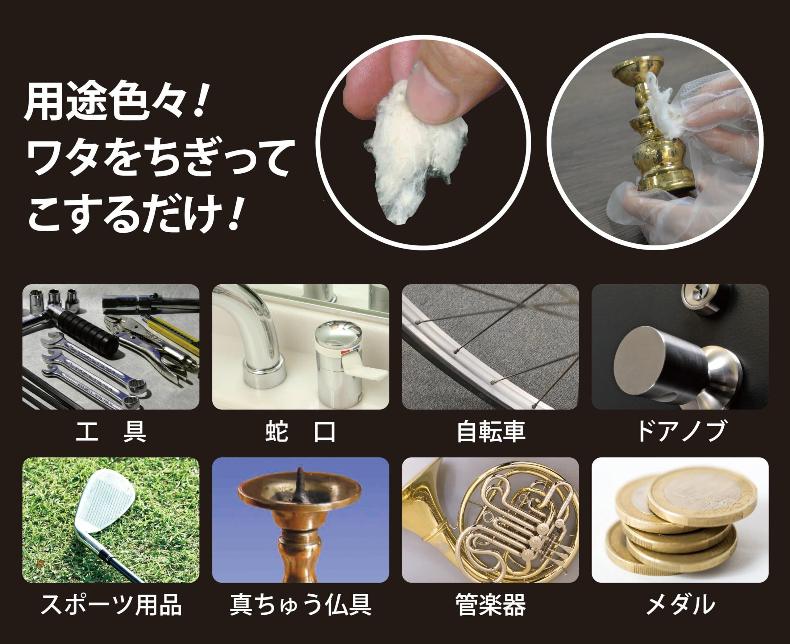 ワタをちぎってこするだけで、金属のサビ・汚れをとり除きます。
