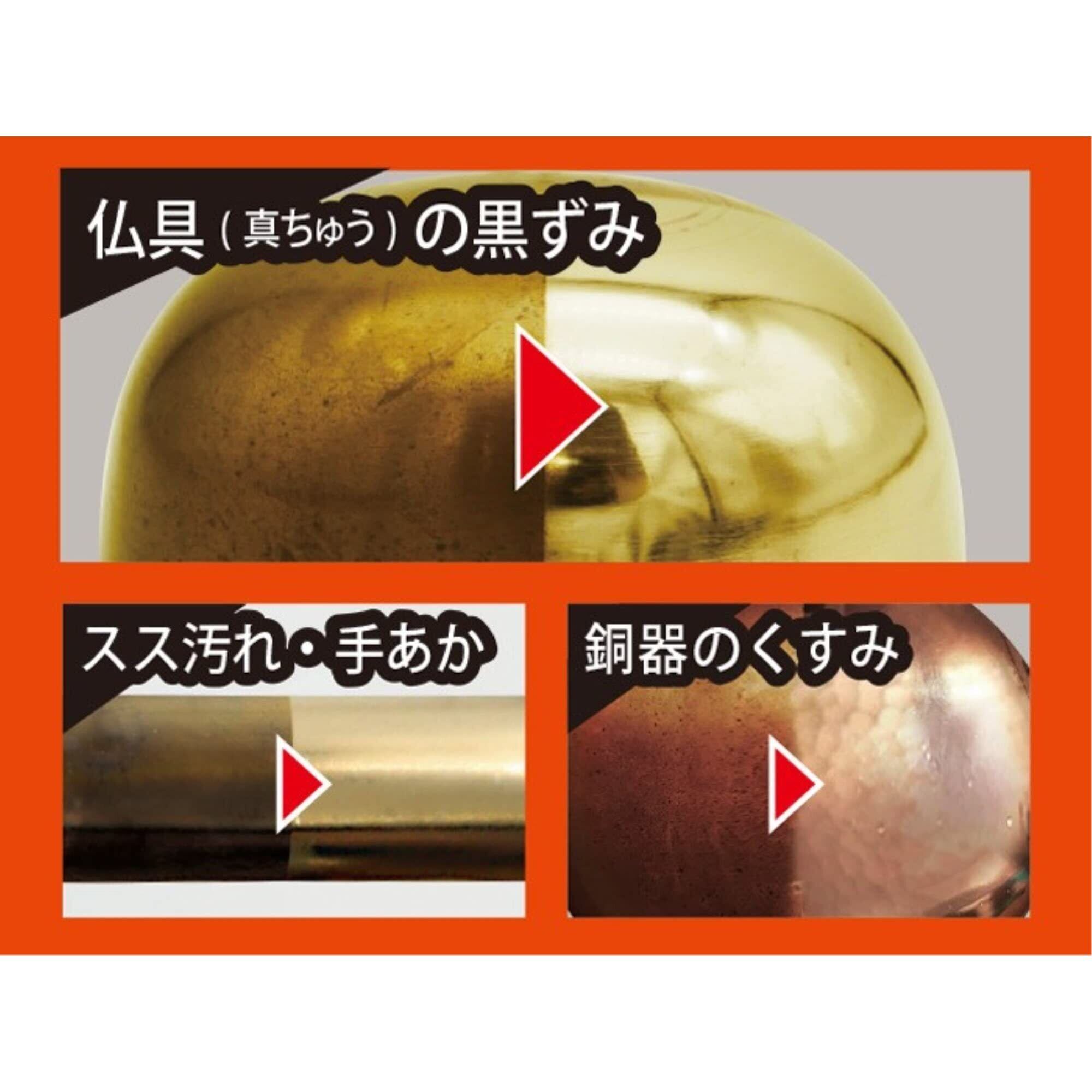 真ちゅう(仏具等)の黒ずみ・くすみ・ロウソク・線香等のスス汚れ、手あか取り。