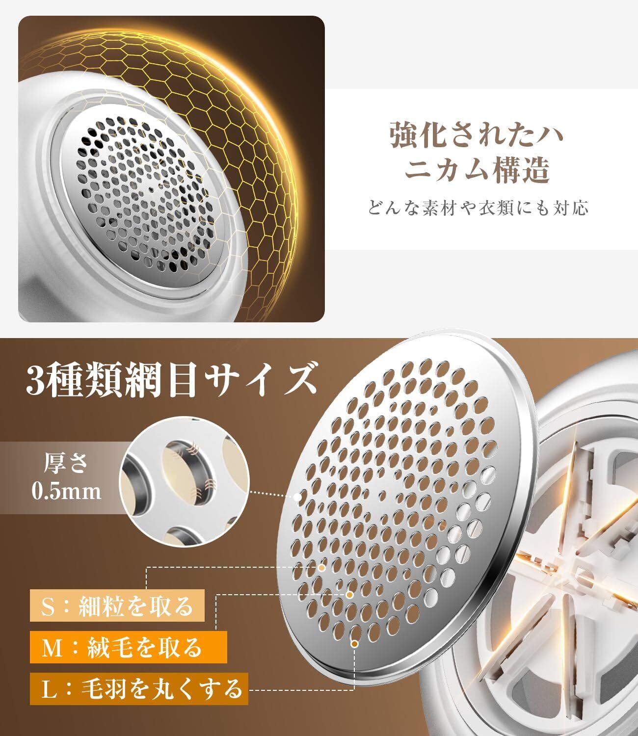 【最新ハニカムメッシュ設計で生地に優しい】0.5mmの厚さのステンレス製ハニカムカバーが搭載されており、表面は滑らかで変形しにくく、繊細な衣類にも使いやすくなっています。衣類表面にしっかり密着して、異なったサイズの穴で様々な毛玉に対応、衣類を傷めずに毛玉を繊細に除去します。約直径52mmのワイドなヘッドで、広範囲の毛玉を効率的に取り除き、手間と時間を節約できます。