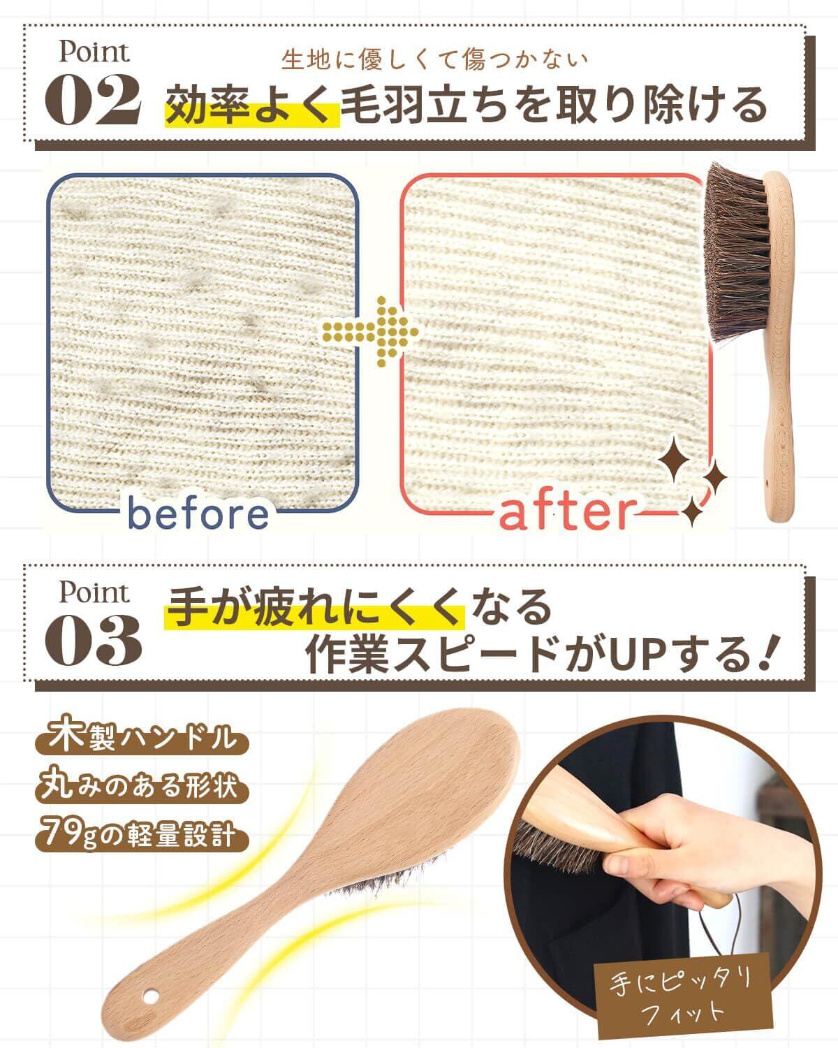 『高級天然馬毛100%使用・服の艶を甦らせる』高品質な天然馬毛を100%使用したソフトタッチのSOMOTO 洋服ブラシは、柔らかくしなやかな毛先が生地を傷めることなく、服の繊維に潜むホコリや毛玉をやさしく取り除きます。さらに、馬毛の自然な艶出し効果により、長く使うことで服の輝きと風合いを取り戻し、上品な仕上がりを実現。