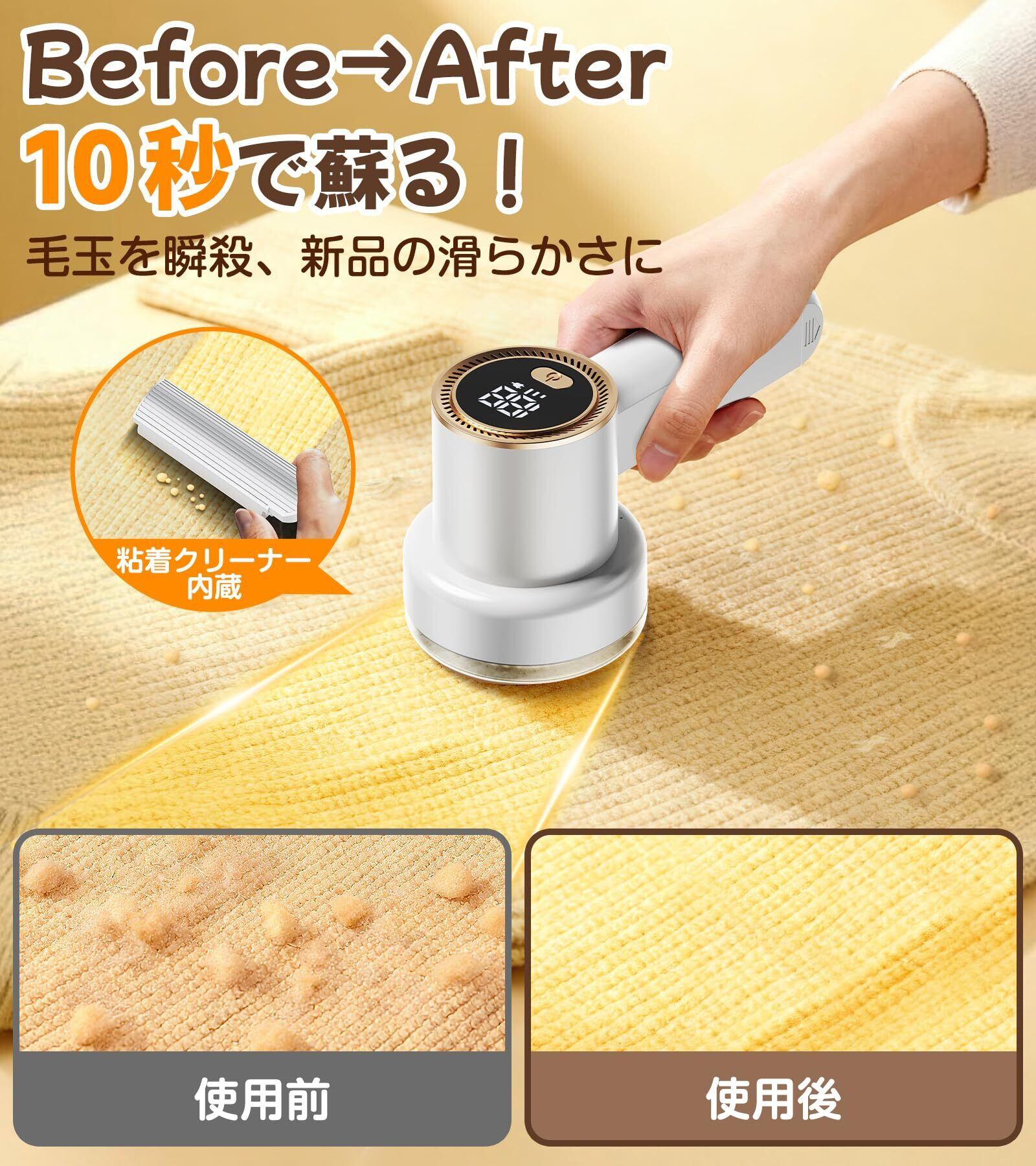 【チャイルドロックと充実のセット内容】 お子様の誤操作を防ぐ安全なチャイルドロック機能で、ご家族のいるご家庭でも安心して使えます。セットには毛玉取り器本体、USB充電ケーブル、粘着ローラー、替用粘着シート、クリーニングブラシがすべて含まれています。開封後すぐにそのまま使える、衣類ケアに必要なものが揃った豪華セットです。