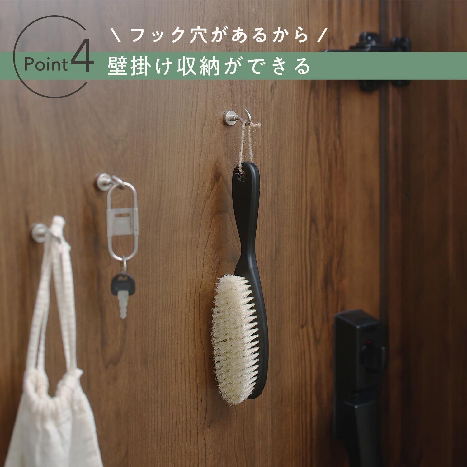 【握りやすい柄】手に握りやすい形で、手にしっかりフィット。柄にはフック穴が開いているので、フックやひもを通せば玄関先やクローゼットに掛けて収納ができます。