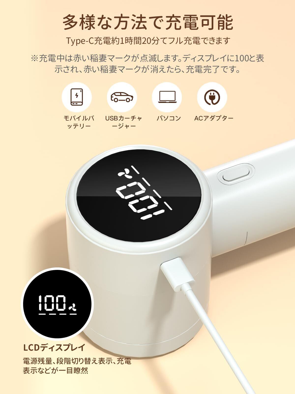 【LED液晶ディスプレー&TYPE-C充電】毛玉取りLEDディスプレイ搭載しており、スイッチをオンにすると、 電池残量 / 段階モード が /充電状態一目瞭然 分かります!ご使用中に突然電源が切れたり、残量が分からなくなるような心配は一切ありません。 けだまとり 電動はTYPE-C充電設計を採用しており、どこでも使用可能です。電池が切れても、電源コードを接続して使用することができます。毛玉取りコンパクトで軽量(140g)な設計のため、旅行先やご家庭で便利にご利用いただけます。