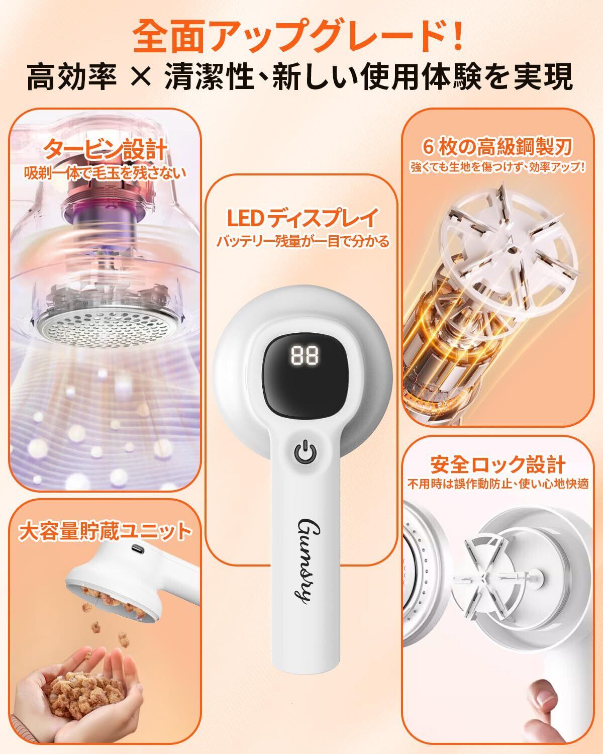 Gumsry 毛玉取り けだまとり 電動 毛玉クリーナー 毛玉とり 強力6枚刃 3段階のスピード調整 LCD残量表示 Type-C充電式 安全装置 軽量 旅行 専業主婦 家庭用ギフト 替え刃1枚付属 贈り物 日本語取扱説明書付き | 毎日発送✿はなまる