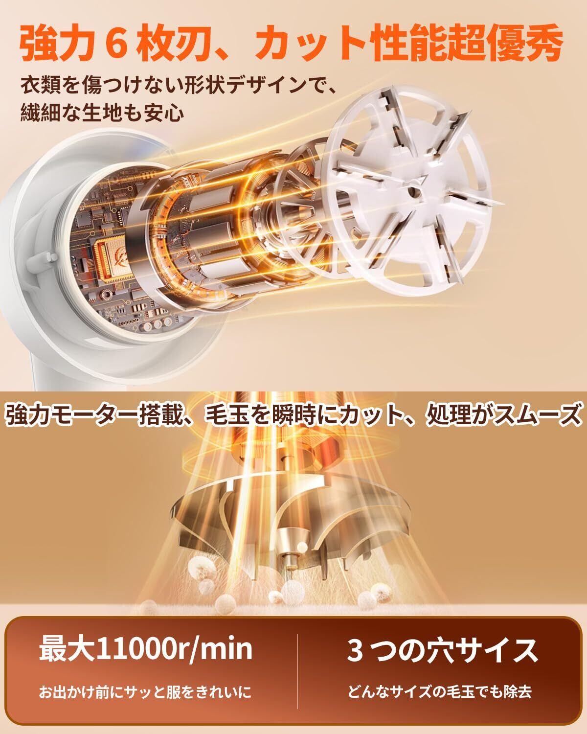 【11000rpm&高速 6 枚刃】高硬度ステンレス6枚刃を搭載し、上下浮動で衣類に密着。8000rpm高速モーターで、単体毛玉や塊状繊維くずを瞬時切断・除去。処理後は毛羽立ちなく、新品のような滑らかさを回復し、日常ケアやシーズン替えに最適。