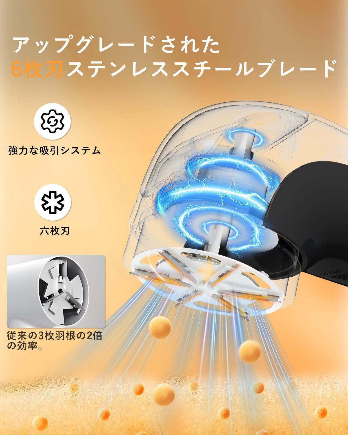 【アップグレード6枚刃】電動 毛玉取りは6枚のステンレス鋼ブレードを搭載し、従来の3枚刃設計の2倍の効率を実現。強力な吸引システムと3サイズの穴を備えたメッシュキャップにより、衣類の毛玉やピリングを効果的かつ素早く除去します。