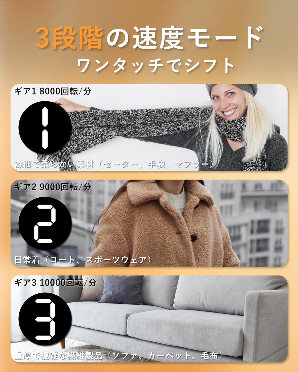 【3段階速度調節】毛玉取り 電動は3段階の速度調節機能(8000回転/分、9000回転/分、10000回転/分)を搭載。セーターやマフラーなどのデリケートな衣類から、カーペットや毛布などの厚手の生地まで幅広く対応します。ボタンを押すだけで速度を切り替え、用途に最適な設定を選択可能です。この電動ファブリックシェーバーで、生地を簡単に蘇らせ、新品同様の見た目に。