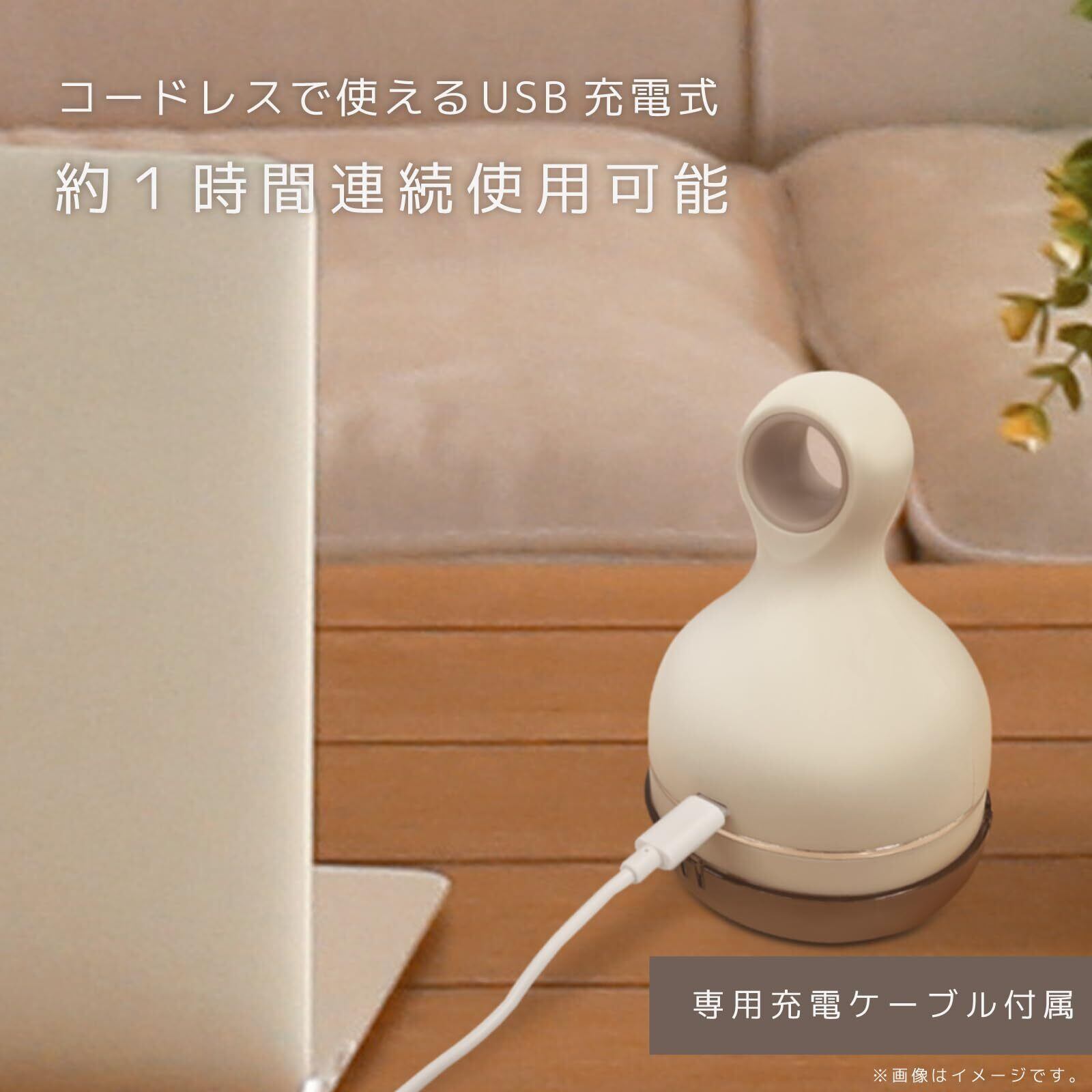 コードレスで使えるUSB充電式の毛玉取り器です。充電満タン時に連続で最大1時間使用できます。専用USB充電ケーブル(約1m)が付属。 ※充電器は付属していません