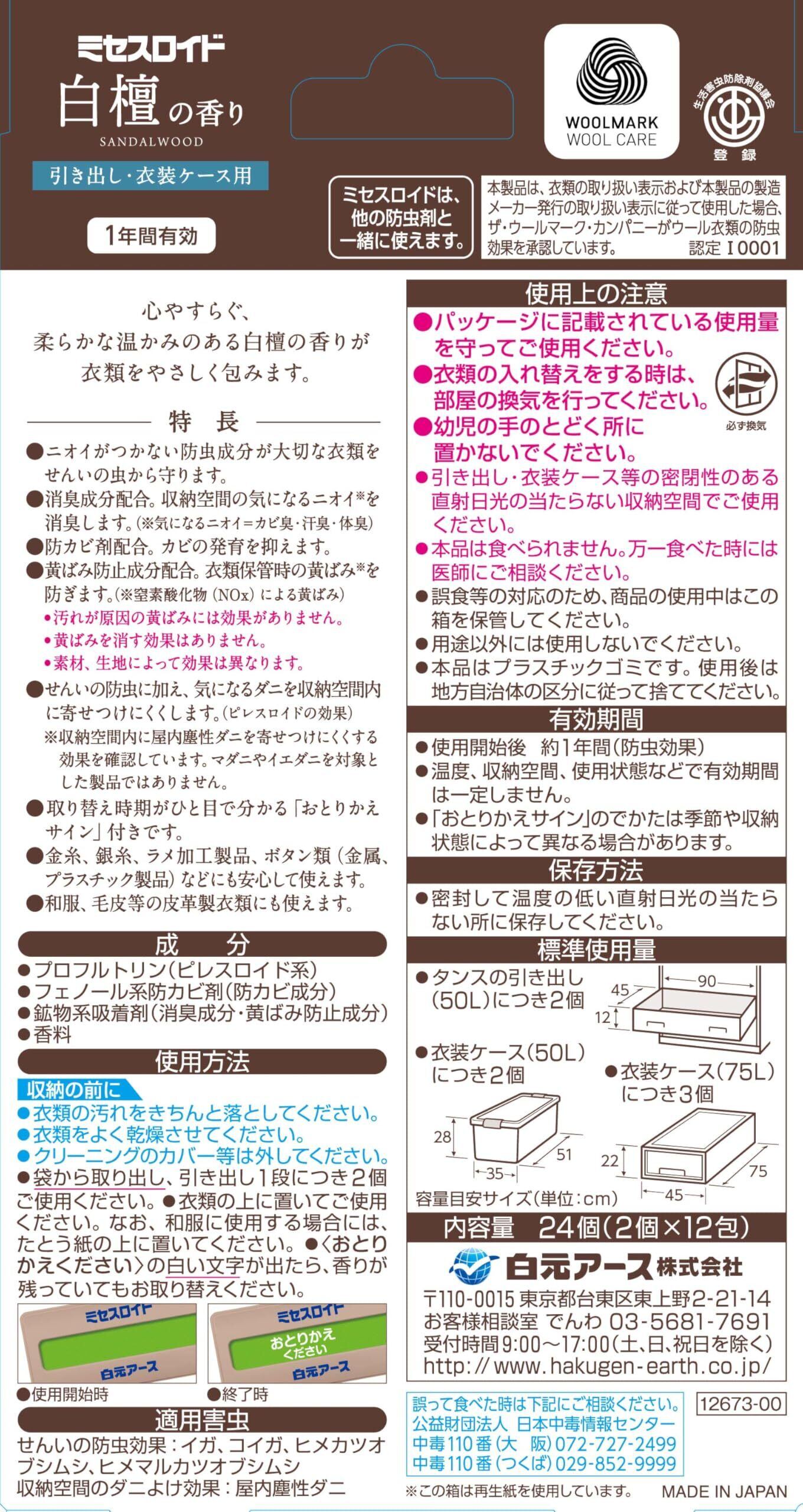 ミセスロイド 引き出し用 24個入 1年防虫 白檀の香り サンダルウッド 1年間有効 収納空間のダニよけ効果付き 虫除け 防カビ 消臭 黄ばみ防止