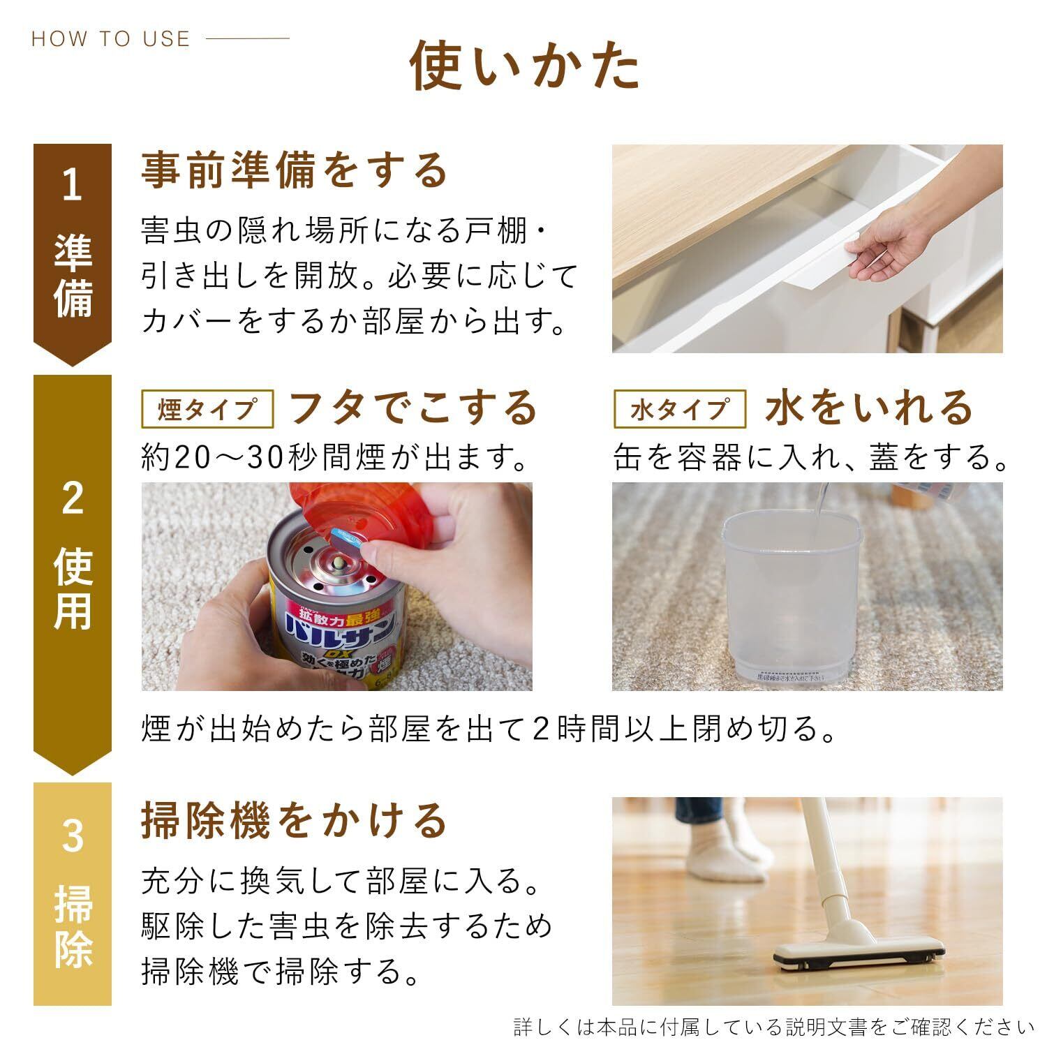 ●バルサン独自の強力な噴射力で、お部屋のスミズミまで煙が届き、隠れた不快害虫によく効きます。