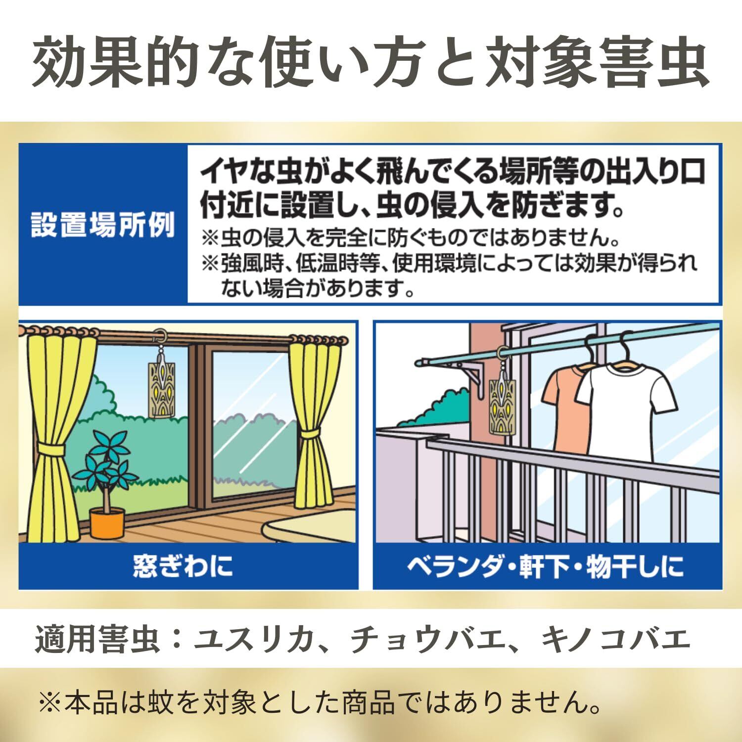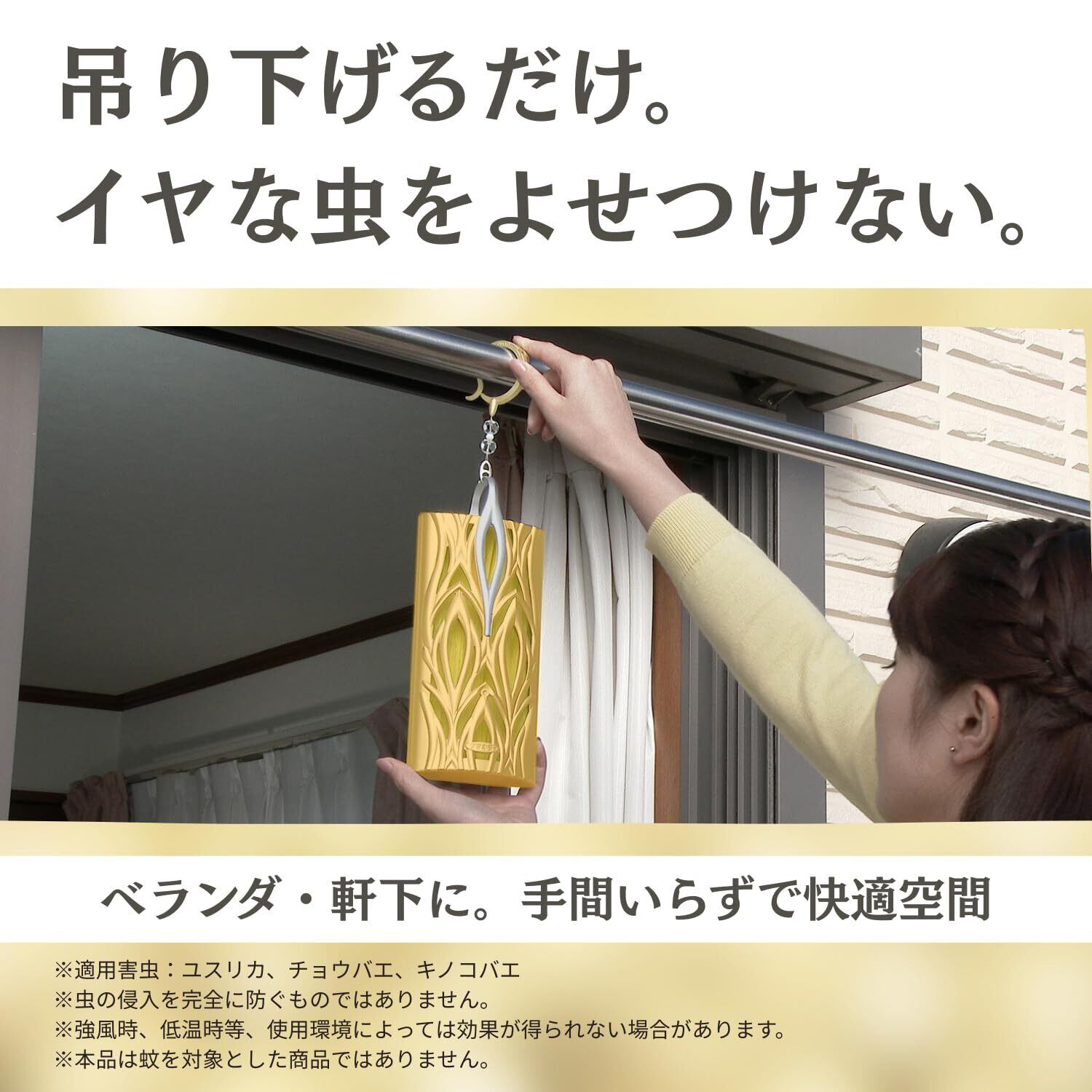 ベランダや軒下に吊下げておくだけでイヤな虫の侵入を防ぎます。この虫よけバリアはエコフレンドリーで、使用時の注意事項は特にありません。