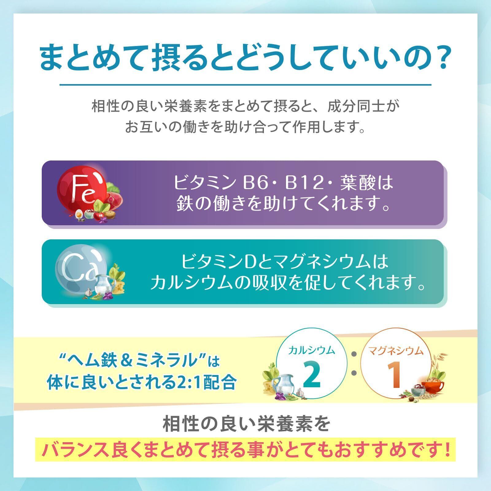 【まとめて摂るのが効果的】相性の良い栄養素をまとめて摂ると、成分同士がお互いの働きを助け合って作用します。たとえばビタミンB6・B12・葉酸は鉄の働きを助けてくれます。ビタミンDとマグネシウムはカルシウムの吸収を促してくれます。(“ヘム鉄&ミネラル”はカルシウムとマグネシウムを、体に良いとされる2:1で配合。)【召し上がり方】1日5粒を目安に多めの水またはぬるま湯と一緒にお召し上がり下さい。