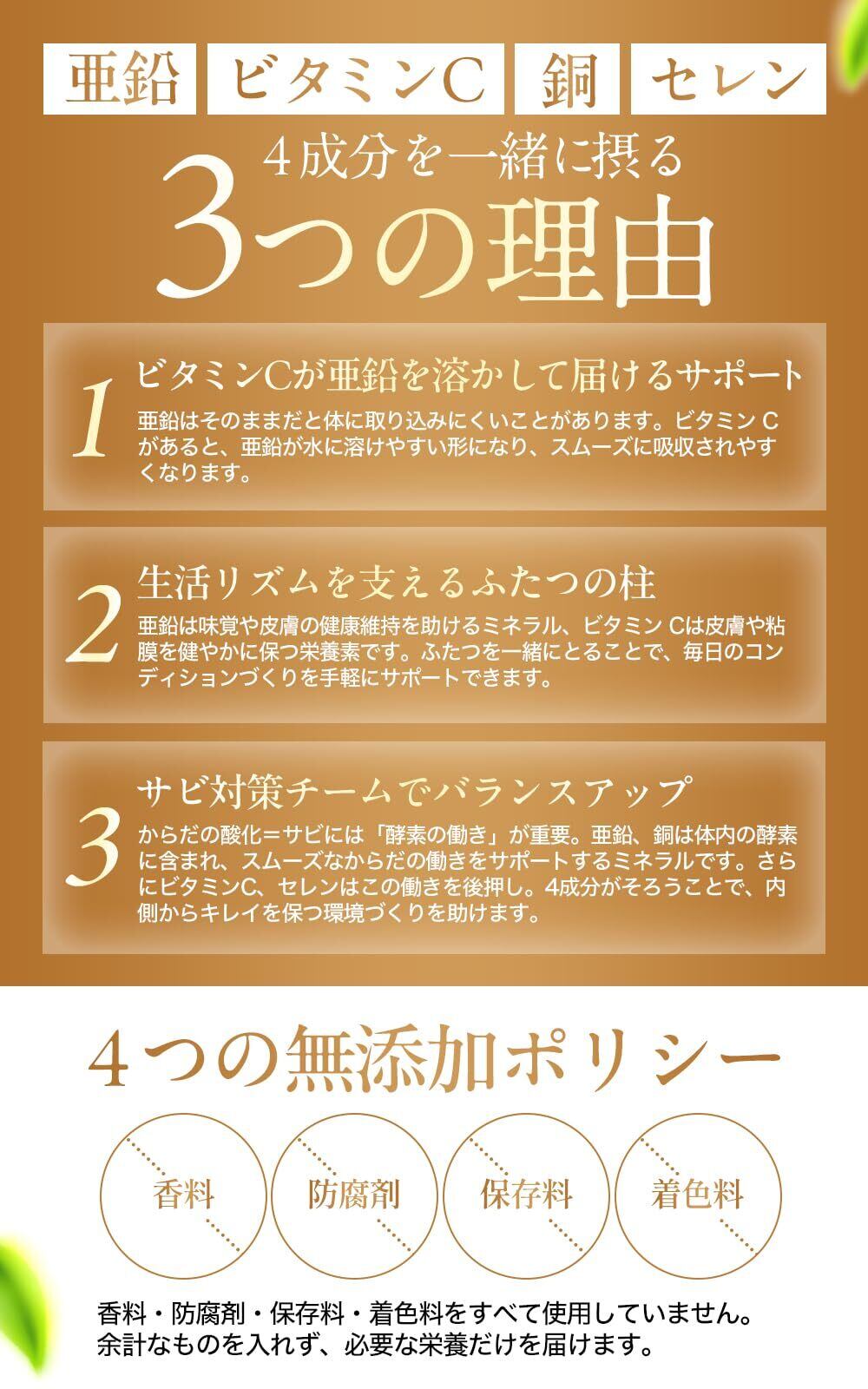 【 亜鉛 × ビタミン C × 銅 × セレン ――4 成分を一緒にとる3つの理由 】 1. ビタミン Cが亜鉛を“溶かして届ける”サポート | 亜鉛はそのままだと体に取り込みにくいことがあります。ビタミン Cがあると、亜鉛が水に溶けやすい形になり、スムーズに吸収されやすくなります。 2. 生活リズムを支える“ふたつの柱” | 亜鉛は味覚や皮膚の健康維持を助けるミネラル、ビタミン Cは皮膚や粘膜を健やかに保つ栄養素です。ふたつを一緒にとることで、毎日のコンディションづくりを手軽にサポートできます。 3. “サビ対策チーム”でバランスアップ | からだの酸化=サビには「酵素の働き」が重要。亜鉛、銅は体内の酵素に含まれ、スムーズなからだの働きをサポートするミネラルです。さらにビタミンC、セレンはこの働きを後押し。4成分がそろうことで、内側からキレイを保つ環境づくりを助けます。 <まとめ>ビタミン Cは亜鉛を体に届けやすくし、皮膚や粘膜の健康維持を助けます。亜鉛は味覚や皮膚の健康維持に関わり、銅とバランスをとることが大切です。銅・セレンを組み合わせることで、4 成分が互いのはたらきを支え合い、毎日の健康管理をサポートします。