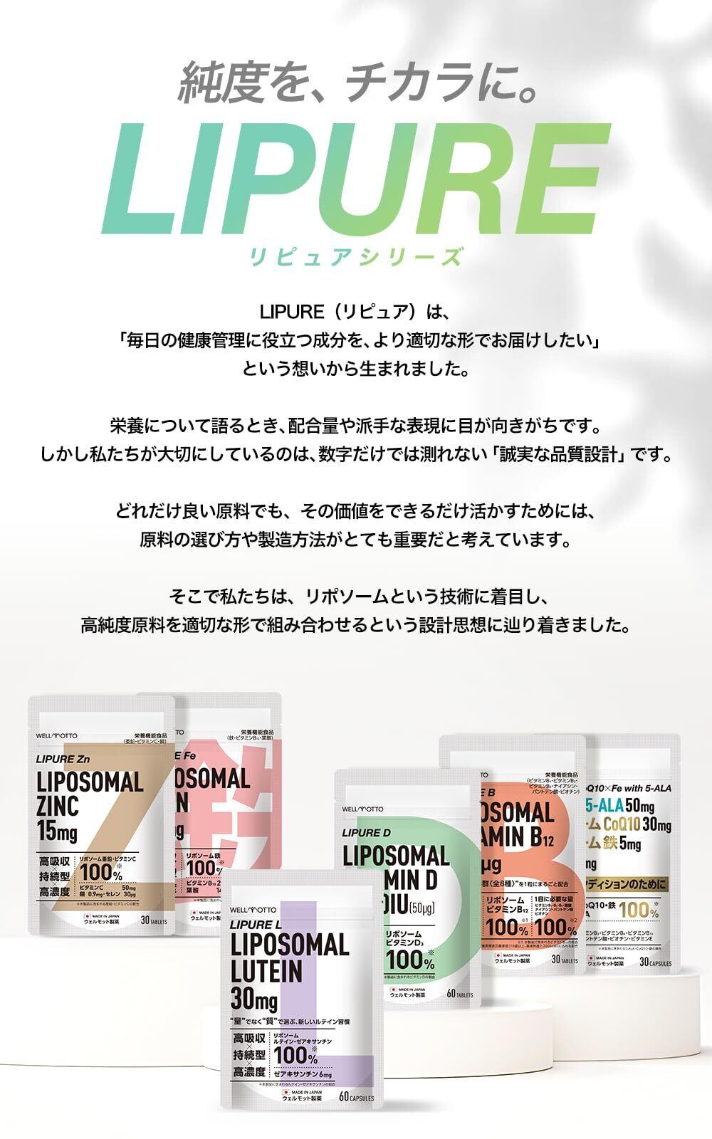 【“届けるこだわり” リポソーム化原料100%使用 】 リポソーム技術とは、成分を体内で効率よく吸収させ、必要な場所に届けやすくし、効果が最大限に発揮されるよう設計する技術です。LIPURE Zn は製品に含まれる 亜鉛 と ビタミンC に対してリポソーム化原料だけを使用し、「 高吸収 × 持続型 × 高濃度 」を実現しました。