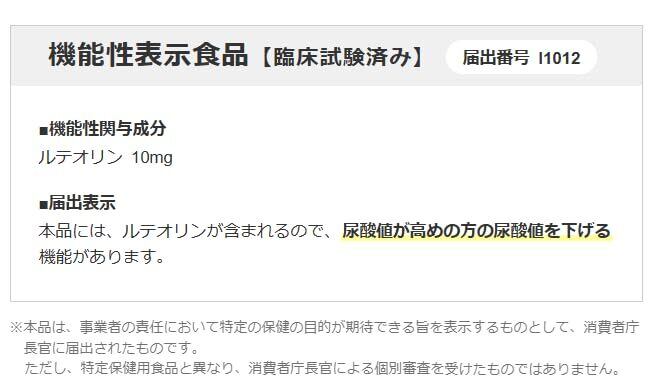 【届出表示[届出番号:I1012]】 本品には、ルテオリンが含まれるので、尿酸値が高めの方の尿酸値を下げる機能があります。
