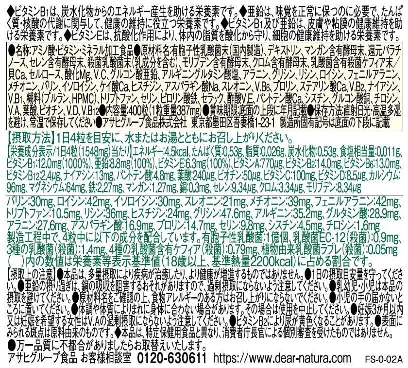 有胞子性乳酸菌末(国内製造)、デキストリン、マンガン含有酵母末、還元パラチノース、セレン含有酵母末、乳酸菌含有殺菌ケフィア末/貝Ca、セルロース、酸化Mg、V.C、グルコン酸亜鉛、アルギニングルタミン酸塩、アラニン、グリシン、リシン塩酸塩、ロイシン、フェニルアラニン、メチオニン、バリン、イソロイシン、ケイ酸Ca、ヒスチジン、アスパラギン酸Na、スレオニン、V.B6、プロリン、ステアリン酸Ca、V.B2、ナイアシン、V.B1、糊料(プルラン、HPMC)、トリプトファン、セリン、ピロリン酸鉄、セラック、酢酸V.E、パントテン酸Ca、シスチン、グルコン酸銅、チロシン、V.A、葉酸、ビオチン、V.D、V.B12