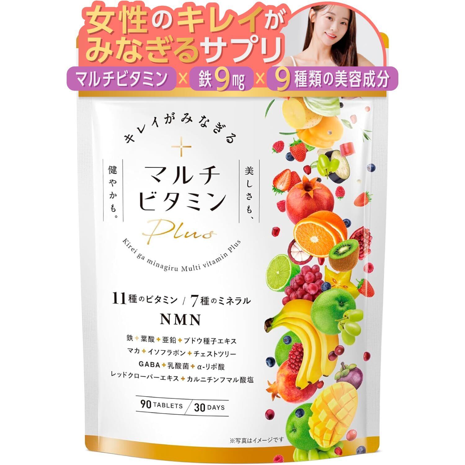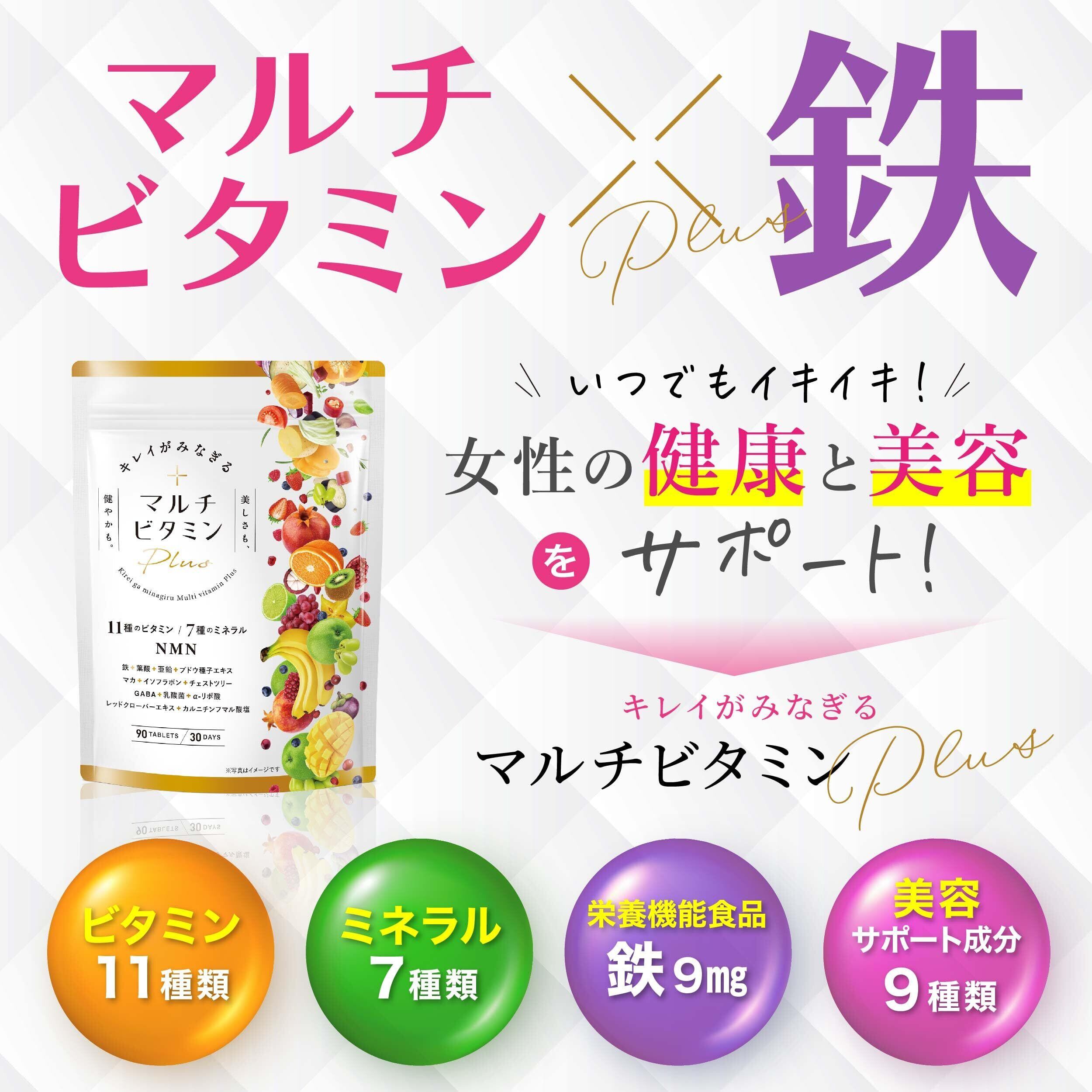 キレイがみなぎるマルチビタミンplus マルチビタミン鉄 葉酸 マカ イソフラボン 亜鉛 NMN 13種類の美容成分 90粒 栄養機能食品 30日分 (1袋)
