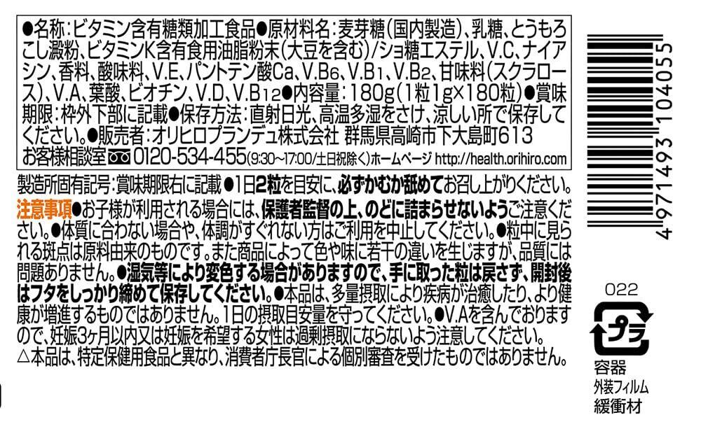 麦芽糖(国内製造)、乳糖、とうもろこし澱粉、イチゴ果汁粉末、ビタミンK含有食用油脂粉末(大豆を含む)/ショ糖エステル、V.C、ナイアシン、香料、酸味料、V.E、パントテン酸Ca、V.B6、V.B1、V.B2、甘味料(スクラロース)、V.A、葉酸、ベニコウジ色素、ビオチン、V.D、V.B12
