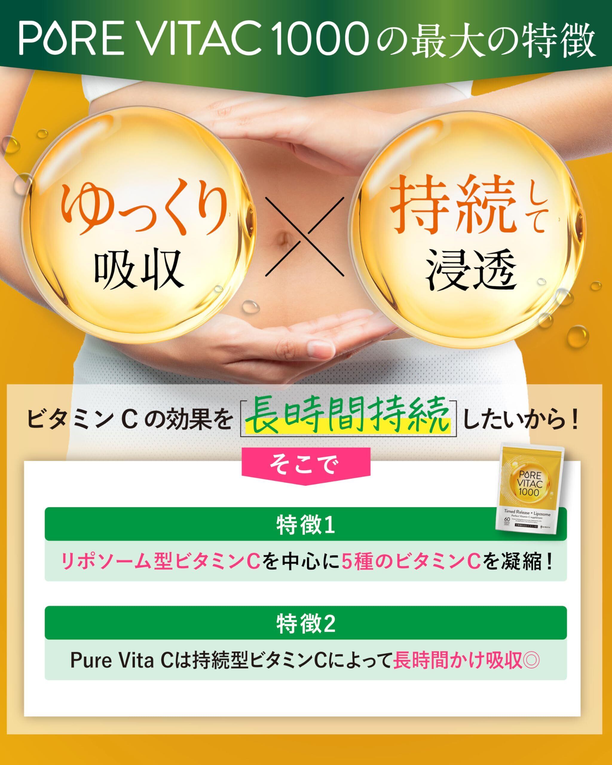ピュアビタC 高濃度 ビタミンC サプリ 1,000mg リポソームビタミンC 30日分 60粒入り L-リジン タイムリリース × リポソーム 独自配合 栄養機能食品 悩み解決ラボ 持続型ビタミンc | 毎日発送✿はなまる