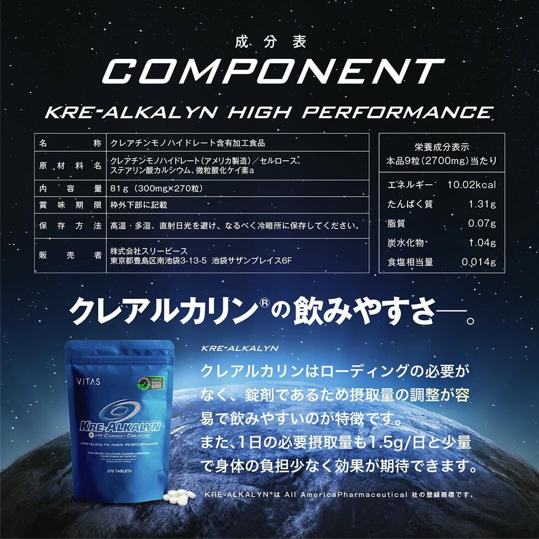 VITAS (バイタス) クレアチン モノハイドレート クレアルカリン 錠剤 270粒 30日分