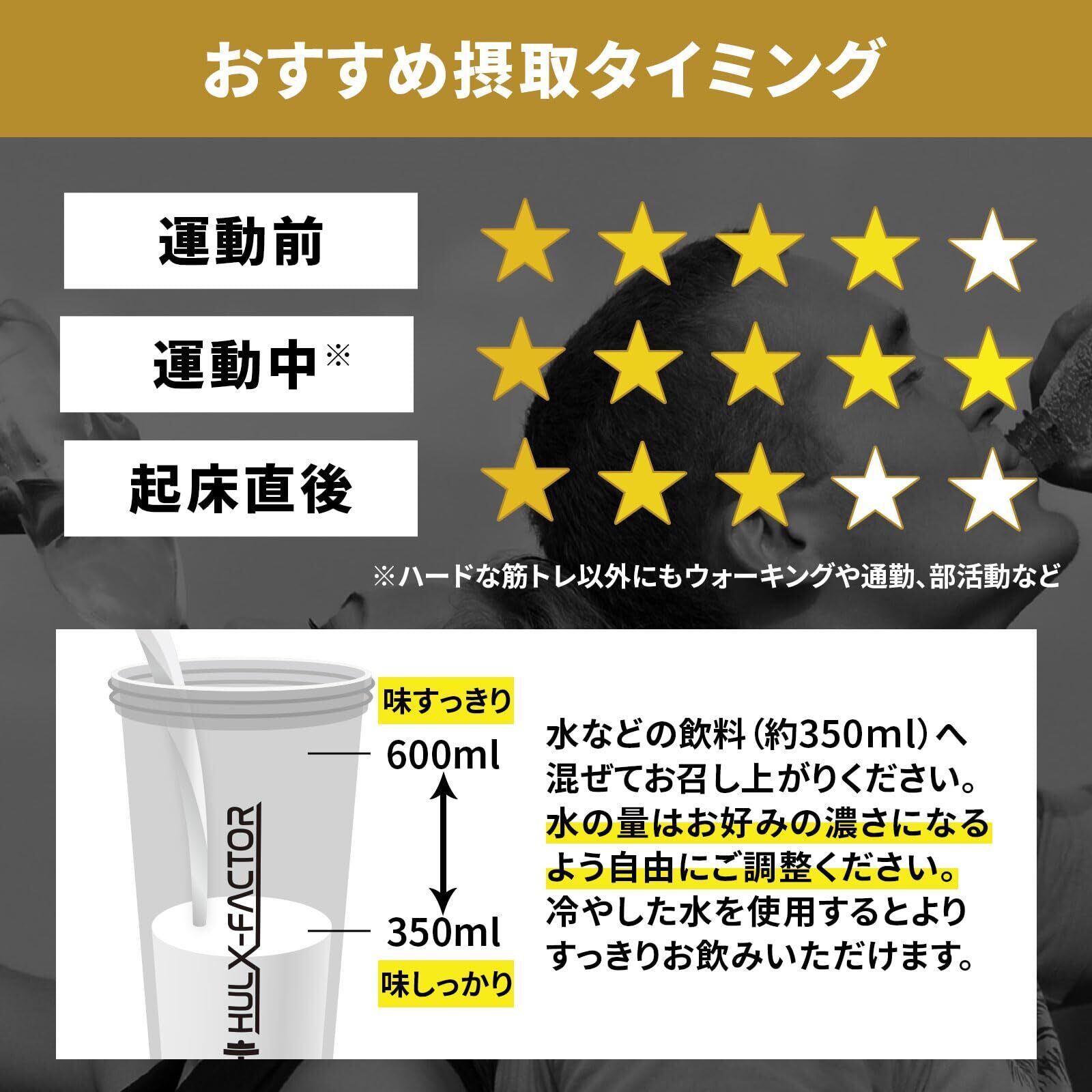 【圧倒的な栄養価】BCAAは、ロイシン・バリン・イソロイシンの比率が非常に重要となり、ハルクファクターはアミノ酸の黄金比2:1:1で構成されています。L-ロイシン 3,000mg/L-バリン 1,500mg/L-イソロイシン 1,500mg/β-アラニン 500mg/ベタイン(TMG トリメチルグリシン)1,250mg *1食12.5gあたり
