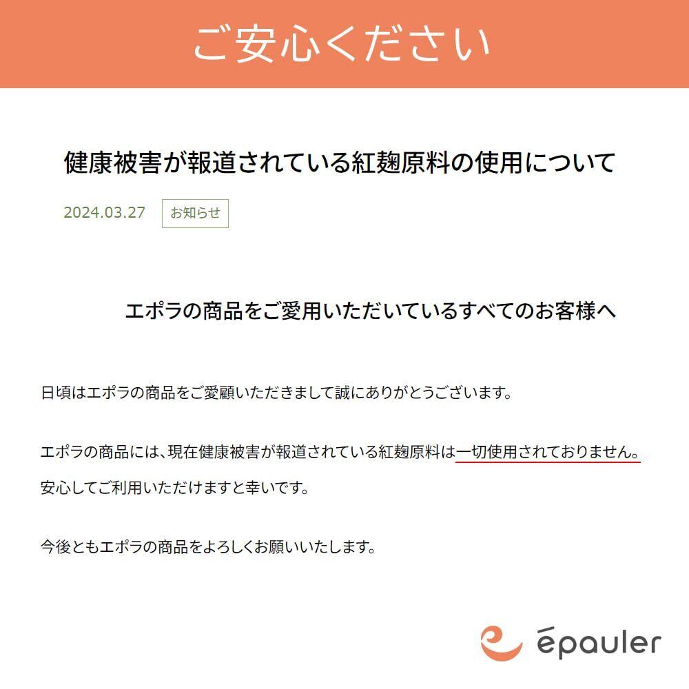【健康被害が報道されている紅麹原料の使用について】エポラの商品をご愛用いただいているすべてのお客様へ。日頃はエポラの商品をご愛顧いただきまして誠にありがとうございます。エポラの商品には、現在健康被害が報道されている紅麹原料は一切使用されておりません。安心してご利用いただけますと幸いです。今後ともエポラの商品をよろしくお願いいたします。