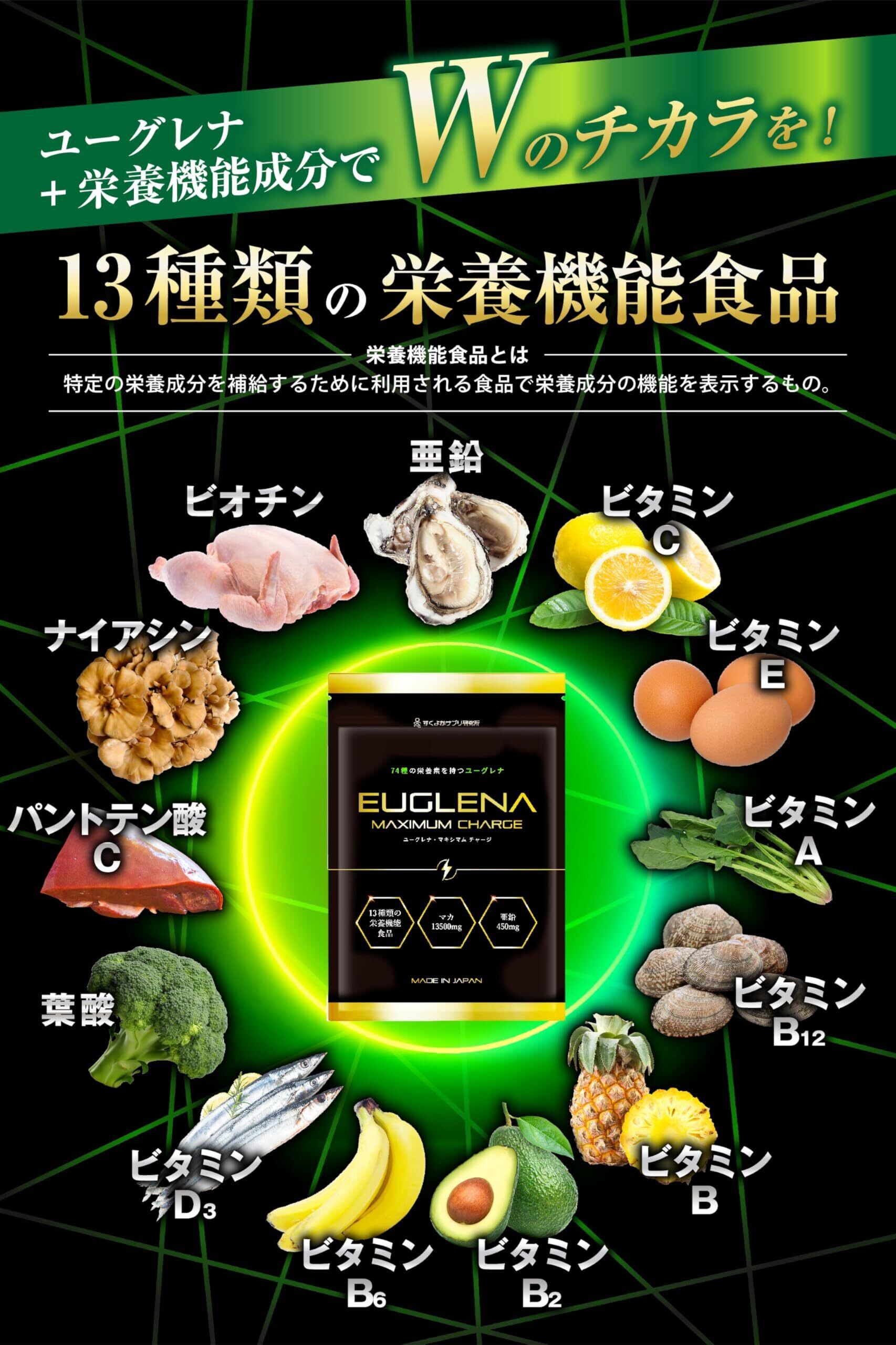 【国の基準に準拠した13種類の栄養機能食品】ユーグレナ以外にも13種類の栄養機能食品(亜鉛・ビタミンC・ビタミンE・ビタミンA・ビタミンB12・ビタミンB・ビタミンB2・ビタミンB6・ビタミンD3・葉酸・パントテン酸・ナイアシン・ビオチン)が入っており、さらには2大アミノ酸であるシトルリンとアルギニンが含有。ユーグレナ+αの効果が期待できます。