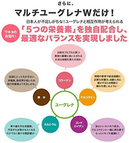 ユーグレナグラシリス、フィッシュコラーゲン、グルコサミン、マルトデキストリン、コンドロイチン硫酸含有、ゼラチン、骨焼成カルシウム、ヘム鉄、グリセリン脂肪酸エステル、二酸化ケイ素(原材料の一部にえびを含む)