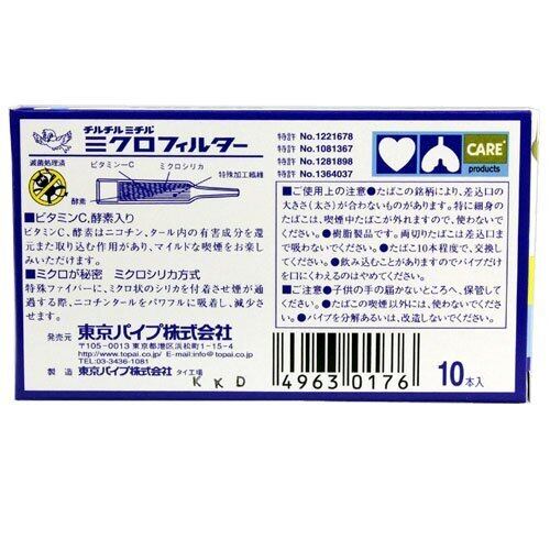 ミクロフィルターは、2つの方式によりニコチン・タールを減少させるミニパイプです。 ①パイプ内部の特殊ファイバーに、ミクロ状のシリカを付着させ煙が通過する際、ニコチン・タールをパワフルに吸着します。 ②特殊ファイバー内に含まれたビタミンC、酵素がニコチン、タール内の有害成分を取り込み、マイルドな喫煙をお楽しみ頂けます。 ※パイプ1個でタバコ5~7本にご使用いただけます。