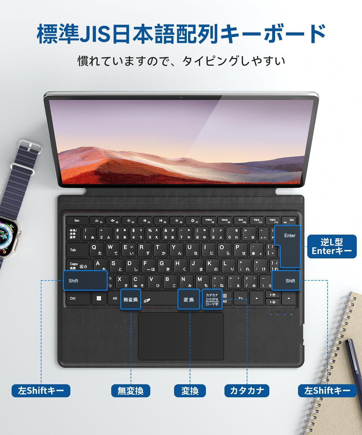 【JIS日本語配列& Bluetooth 接続】surface pro7 キーボードはJIS規格標準日本語配列で、大型のEnterキー、左右shiftキー、左右Altキー、単独な変換、無変換、カタカナキーを配置されて、普段よく使いのキーボードと同じ配列で、使い慣れてからタイピングしやすいです。新型 Bluetooth 5.3チップを採用し、つながりやすさや速度はもちろん、安定性も最大限にアップしました。