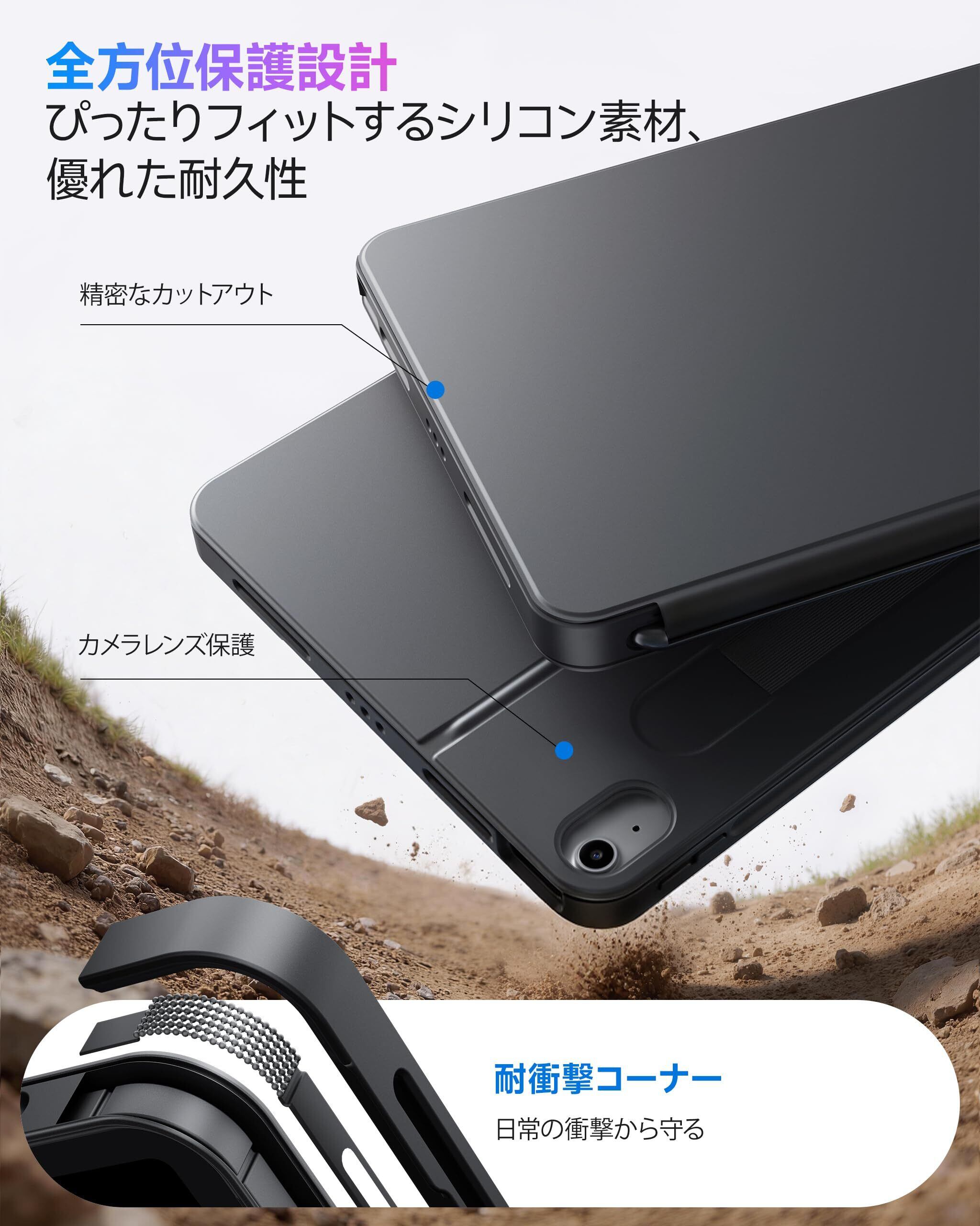 [包括的なiPad保護]: 耐久性を考慮して設計されたHOUのiPadキーボードケースは、高強度シリコーン製で、360°全方位の保護を提供します。弾力性のある磁気ホルダーでApple Pencilをしっかりと固定し、常に手の届くところに置くことができます。