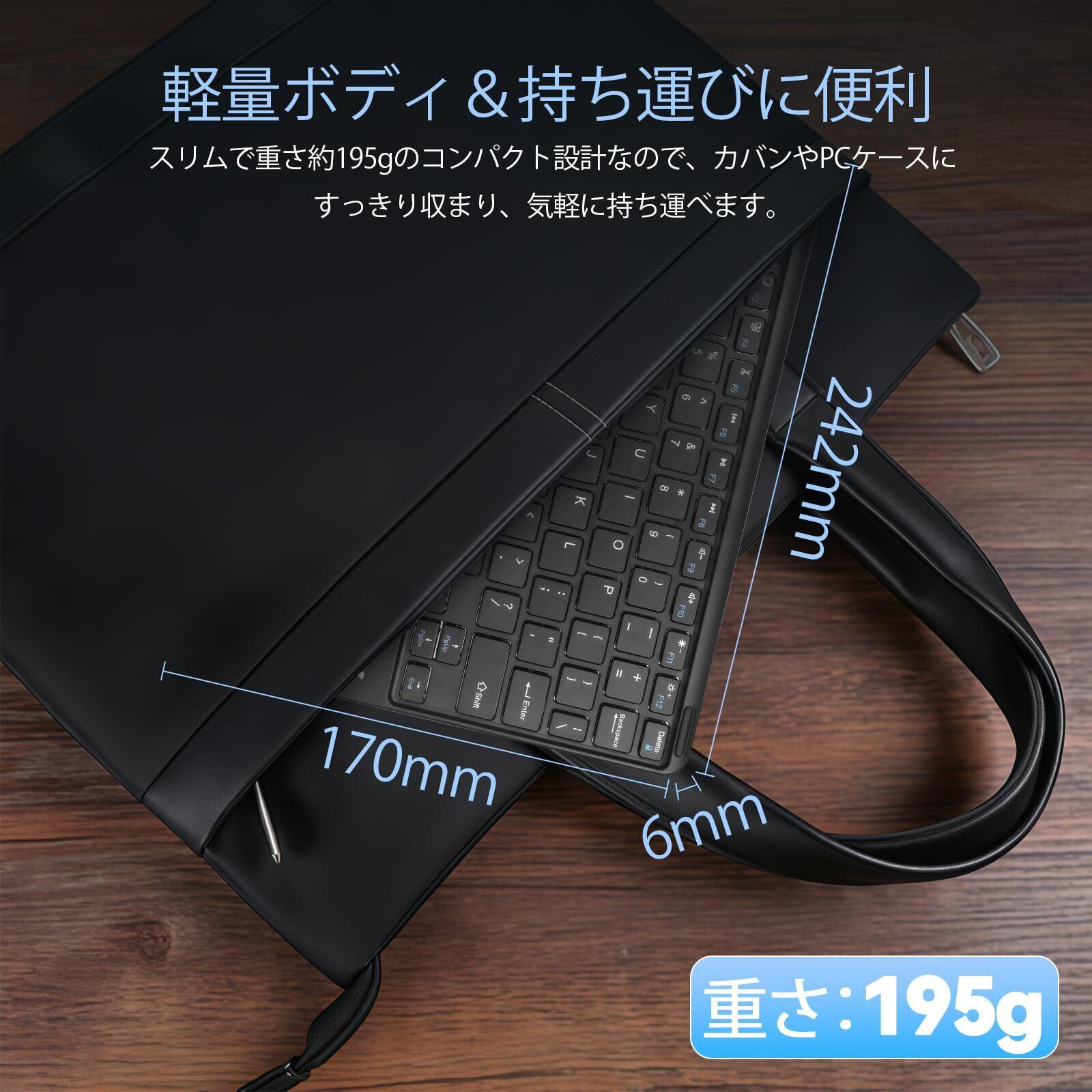 【持ち運びに便利なスリム&軽量ボディ】タッチパッド付きワイヤレスキーボードは、幅242×奥行170mm、厚さわずか6mmと非常にコンパクトな設計です。重さも約195gと超軽量で、カバンやPCケースにもすっきり収まり、持ち運びにとても便利です。通勤・通学・出張など、移動が多い方に最適です。