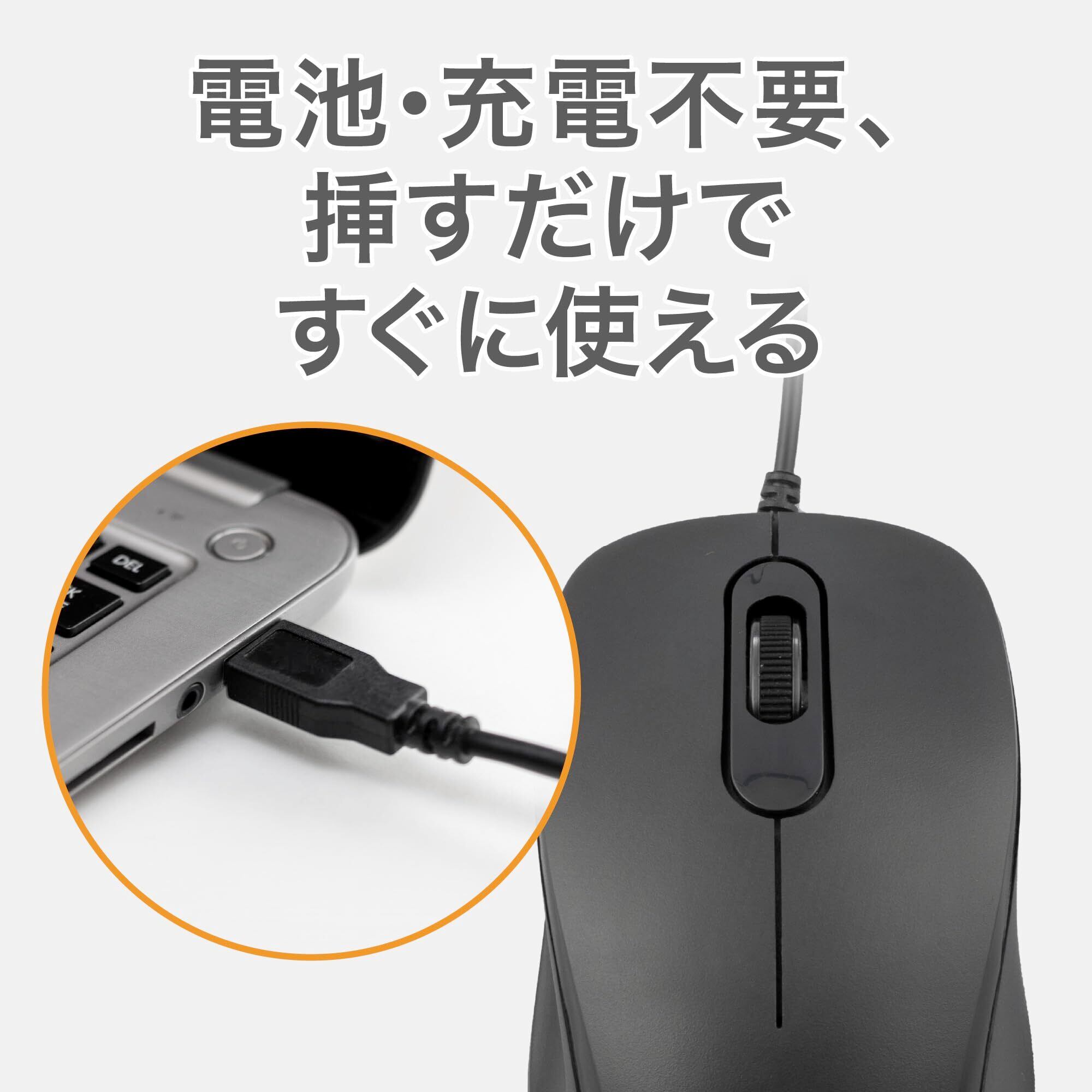 シンプルだから使いやすい。納得の3ボタン静音有線マウス。電池不要、挿すだけの簡単接続ですぐに使える有線マウス。電池交換や充電が不要で、パソコンのUSB-Aポートに接続するだけですぐに使える有線接続タイプです。