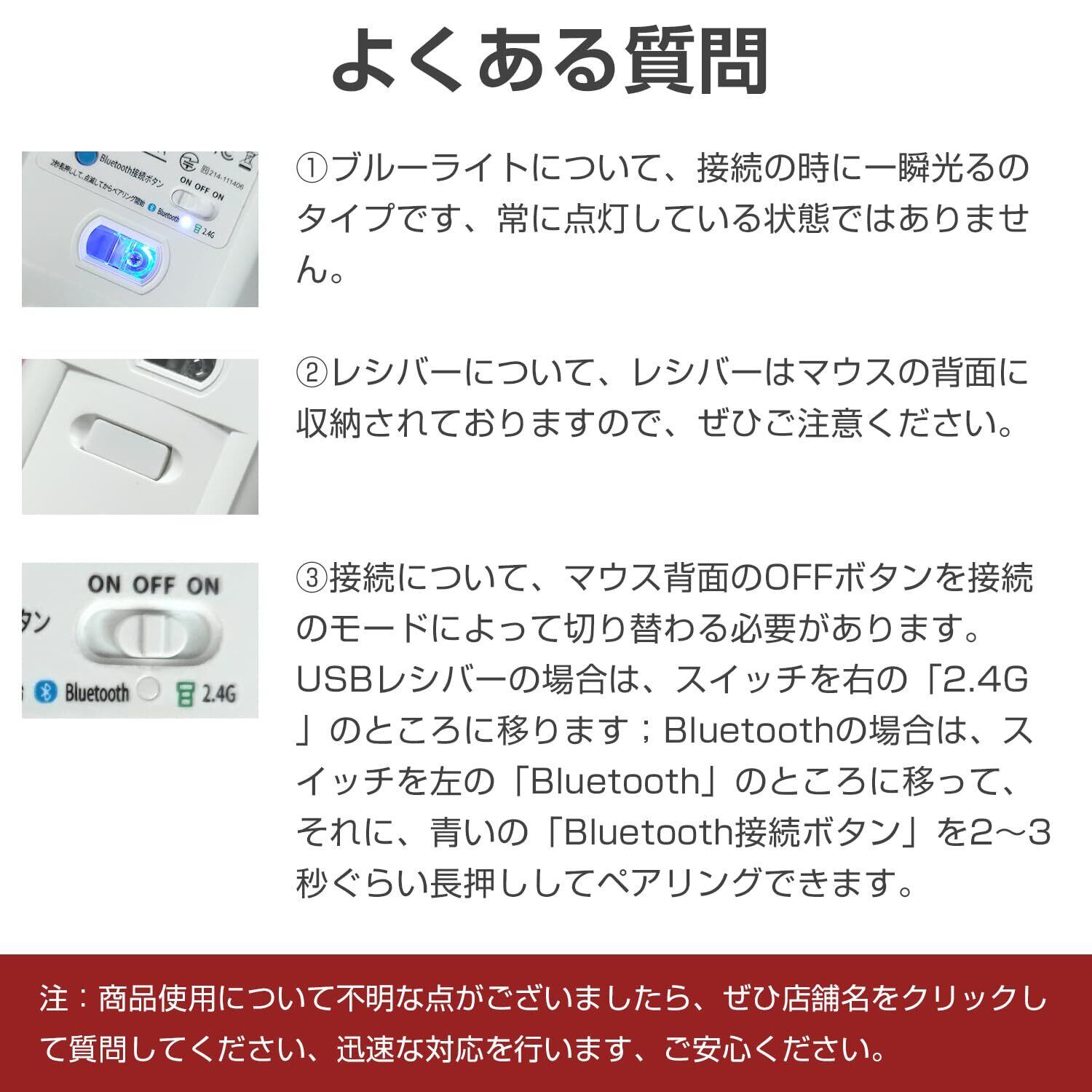 よくある質問: ①ブルーライトについて、接続の時に一瞬光るのタイプです、常に点灯している状態ではありません。 ②レシバーについて、レシバーはマウスの背面に収納されておりますので、ぜひご注意ください。 ③接続について、マウス背面のOFFボタンを接続のモードによって切り替わる必要があります。USBレシバーの場合は、スイッチを右の「2.4G」のところに移ります;Bluetoothの場合は、スイッチを左の「Bluetooth」のところに移って、それに、青いの「Bluetooth接続ボタン」を2~3秒ぐらい長押ししてペアリングできます。 注:商品使用について不明な点がございましたら、ぜひ店舗名をクリックして質問してください、迅速な対応を行います、ご安心ください。
