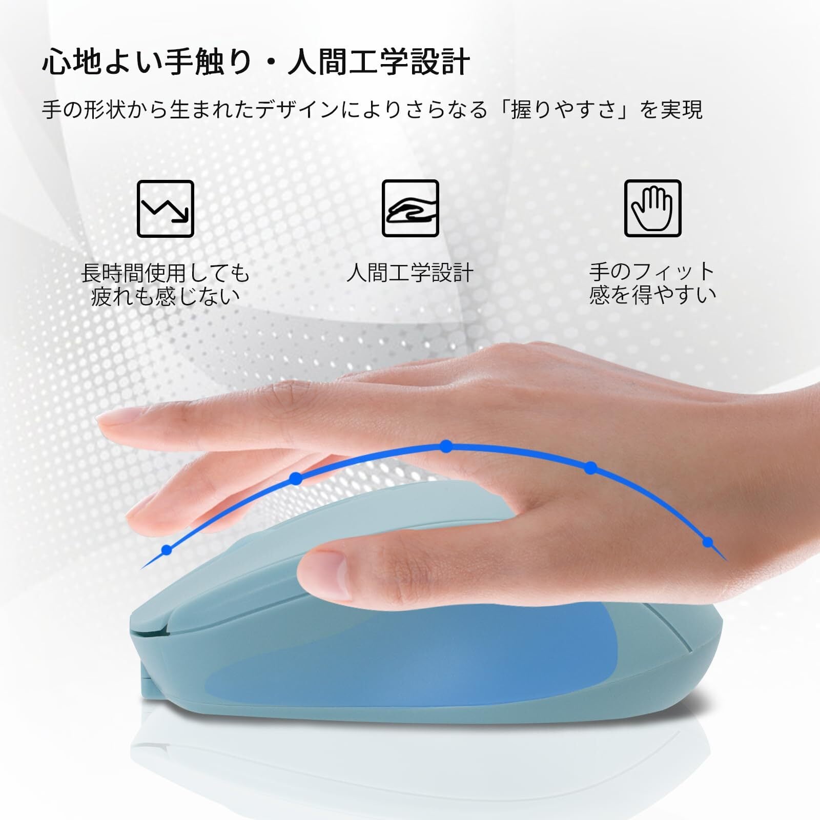 快適な握り心地:ワイヤレスマウスは軽くて表面が滑らかで、人間工学に基づいて設計されています。手のひらにフィットし、手触りが良く、スムーズな使用体験をもたらします。長時間の作業でも手首や指への負担を軽減。